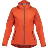 Centre front exposed contrast waterproof zipper, interior zipper flap with chin guard, lower exposed contrast waterproof zipper pockets. interior media pocket, hood with elastic drawcord and exterior cordlocks, adjustable laminated cuff tabs with hook and loop closure, elastic drawcord at hem with interior cordlocks, dropped back hem, lower pocket hem cinch access, easy grip zipper pulls, heat transfer main label for tagless comfort, interior media exit port, fully seam sealed, articulated elbows, ergonomic sleeves, zipper garage pocket feature, shaped seams and tapered waist for flattering fit, laminated peak.