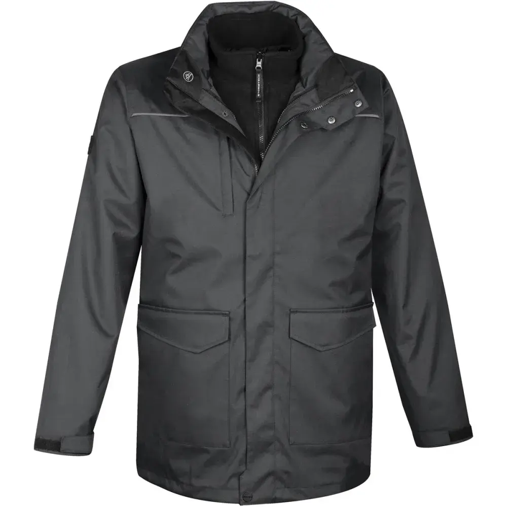All-season 3-in-1 system jacket with a zip-out fleece liner and a durable water-resistant exterior shell constructed with a parka length for extra coverage and protection. Featuring black reflective trim for added visibility, and a zippered chest pocket, internal security pocket and front cargo pockets for ample storage for your valuables.
