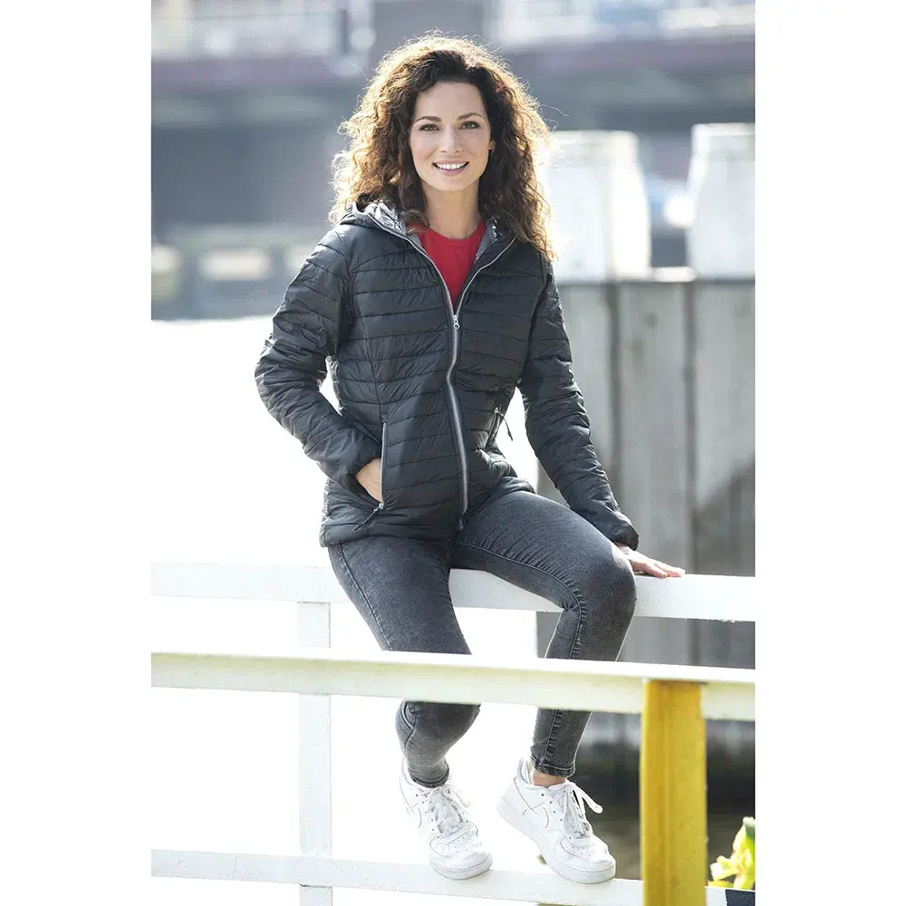 Centre front exposed plastic zipper with contrast tape and teeth, interior zipper flap with chin guard, lower exposed plastic contrast tape and teeth zipper pockets, contrast binding on hood opening, elasticised cuffs, elasticised hem, easy grip zipper pulls, heat transfer main label for tagless comfort, interior media exit port with cord guide, contrast interior stitching detail, LED zipper pull, ergonomic sleeves, zipper garage pocket feature, shaped seams and tapered waist for flattering fit, contrast hanger loop at inside back neck, packable, anger loop at exterior back neck.