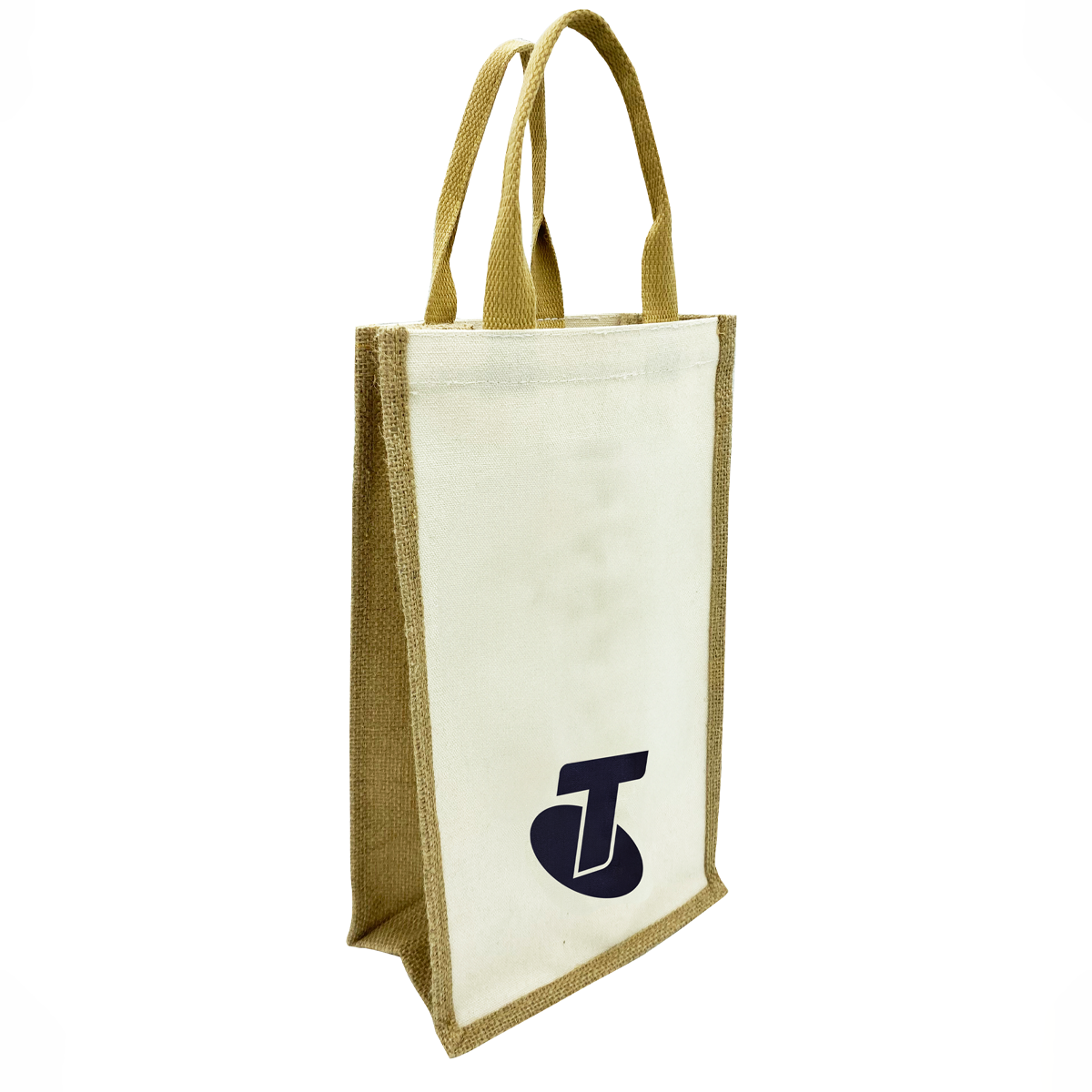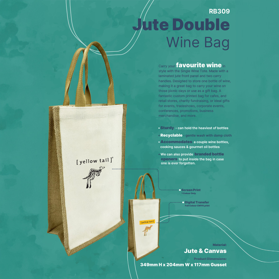 Celebrate thoughtful gifting with the Jute Double Wine Bag. Made from a mix of 300gsm canvas and 280gsm jute with 80gsm lamination, it’s designed to carry two bottles; whether it’s wine, gourmet oils, or sauces. Folds flat when not in use, making it easy to store between occasions.