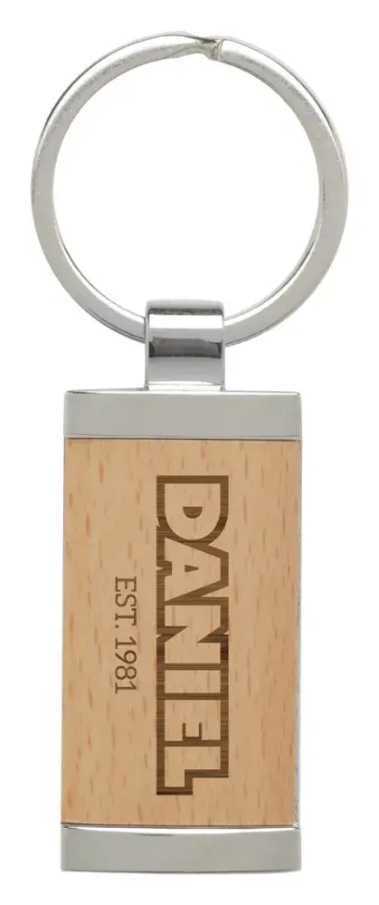 Elegant timber keychain with shiny metal trim presented in gift box.
