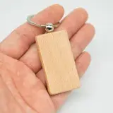 Natural beechwood rectangular shaped key ring. Packed into a black cardboard gift box.