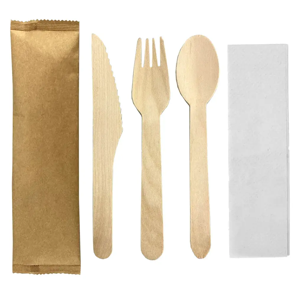 This biodegradable wooden cutlery is made from sustainable sourced with FSC certified Birchwood which is compostable at home or through a commercial compost packed in individual paper bag includes any 2 of knife fork spoon and a napkin. With a flat even surface you all never have to worry about splinters or breakage a great alternative to disposable plastic cutlery. The set is an affordable convenient and eco-friendly cutlery choice perfect for your next barbecue outdoors event or to put in your kid s lunch box.