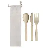 This set of cutlery is made of wheat straw starch and 50% of food-grade PP. Includes 1x fork 1x knife 1x spoon packed in a cotton bag. Renewable biodegradable BPA free and dishwasher safe. The use of disposable plastic products is no longer recommended as it pollutes the environment. This set of cutlery is convenient and easy to carry around you can put in the bag at any time perfect for travel business trip camping daily use.