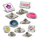 Metal lapel pins which are available in six standard sizes and shapes. They can be branded in spot colours or full colour with a luxury resin coated finish.