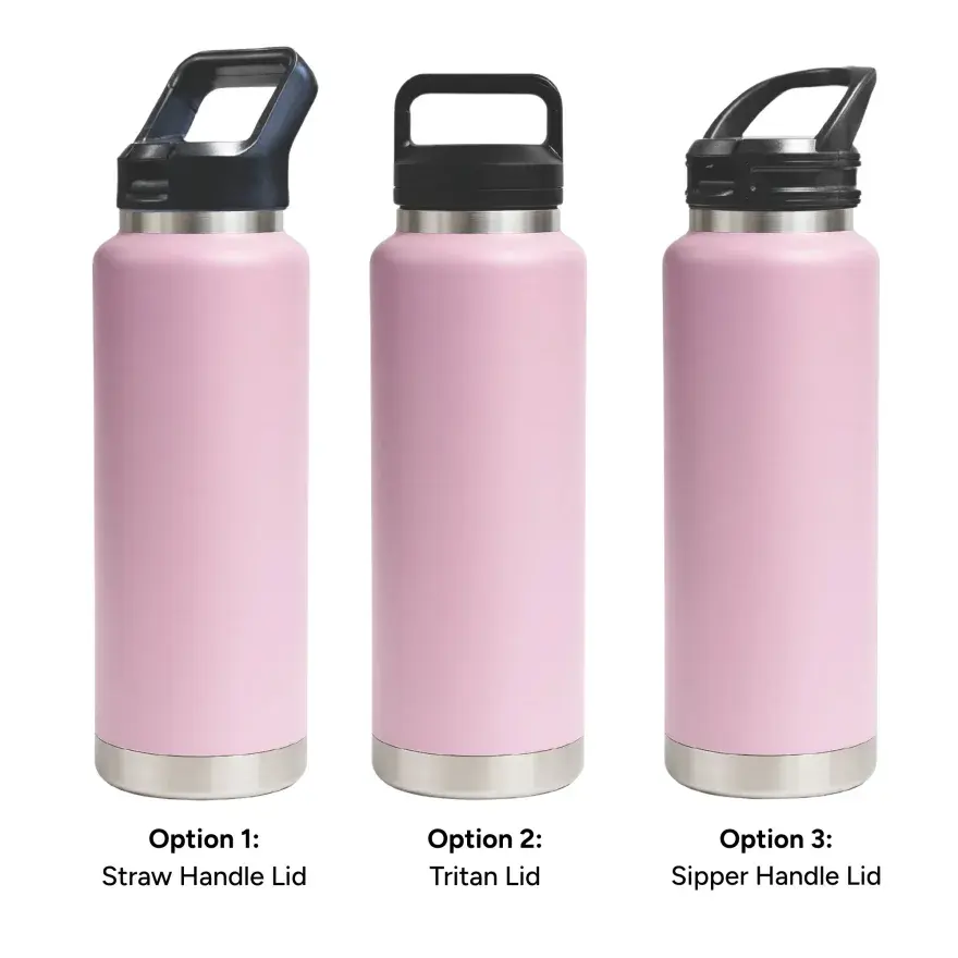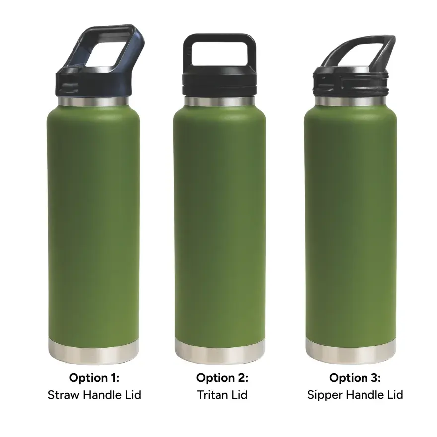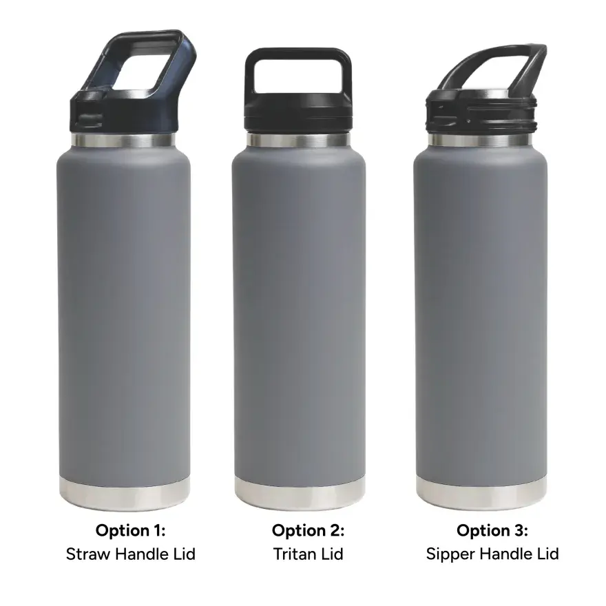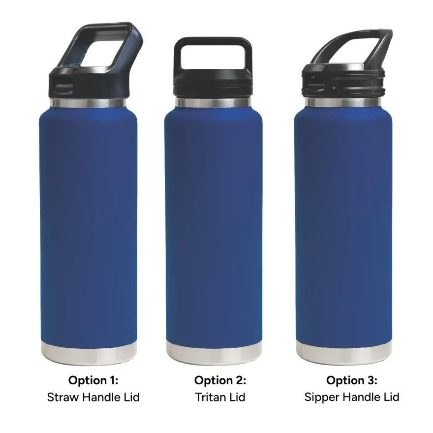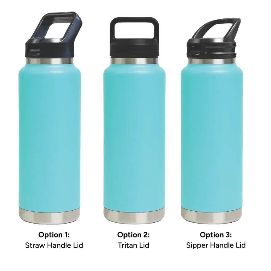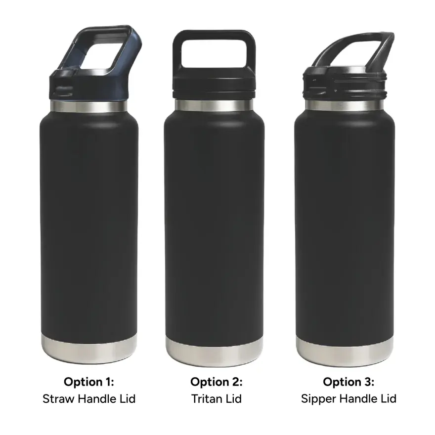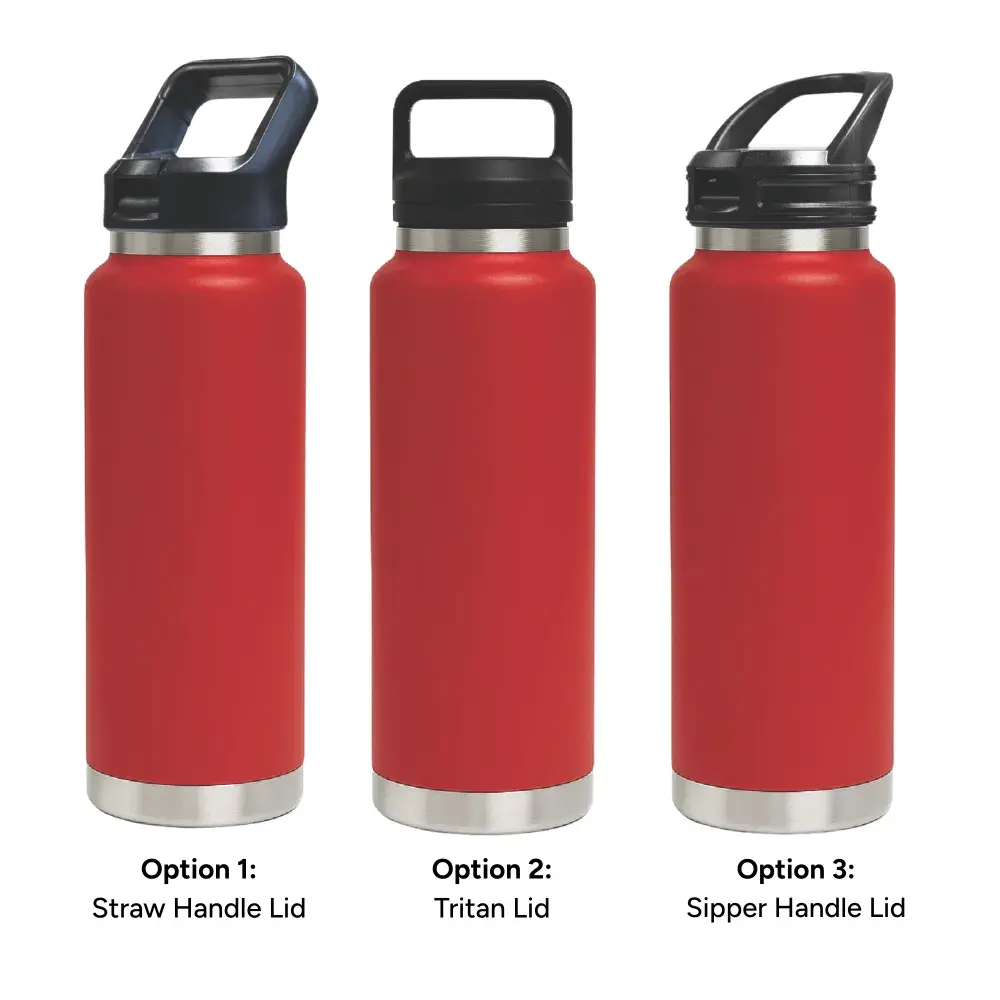 1L capacity for maximum daily hydration. | Made from double-wall stainless steel (304 inside, 201 outside) for superior insulation. | Keeps drinks hot or cold for hours. | Leak-resistant seal for secure, worry-free use. | Available with 3 lid options – Straw Handle Lid (flip-up straw for easy sipping), Tritan Twist-On Lid (sturdy carry handle for portability), and Sipper Handle Lid (practical handle for effortless drinking).