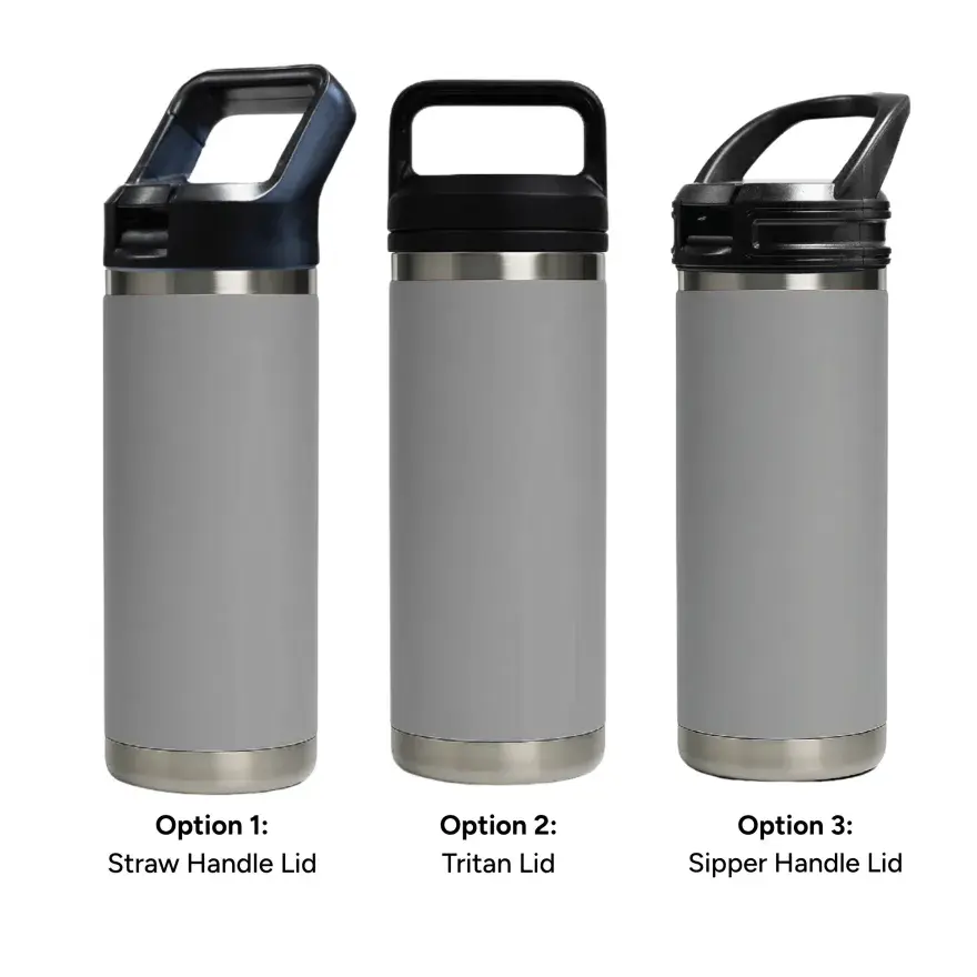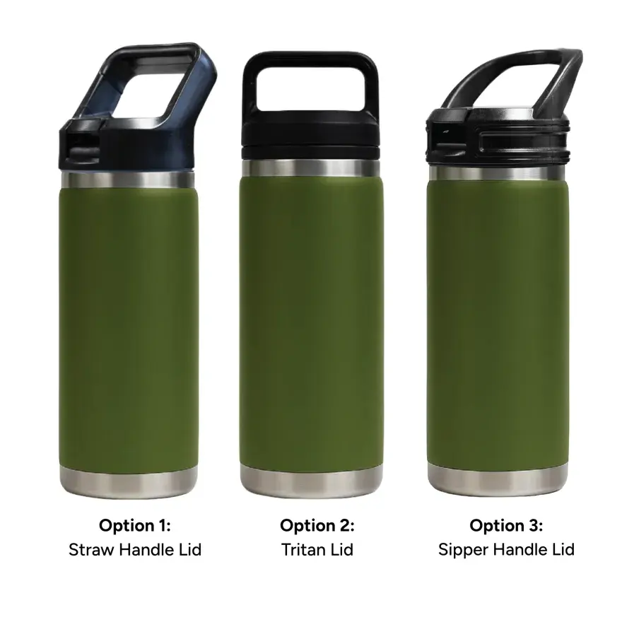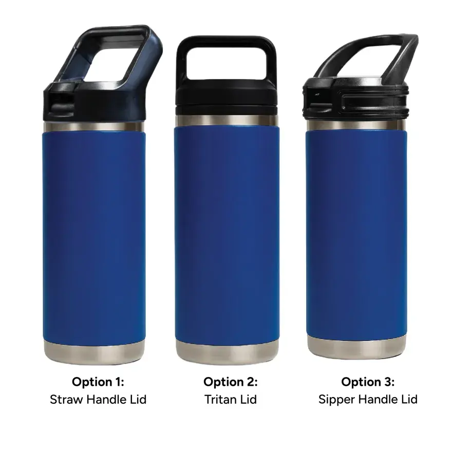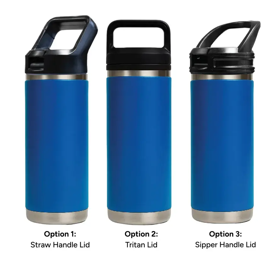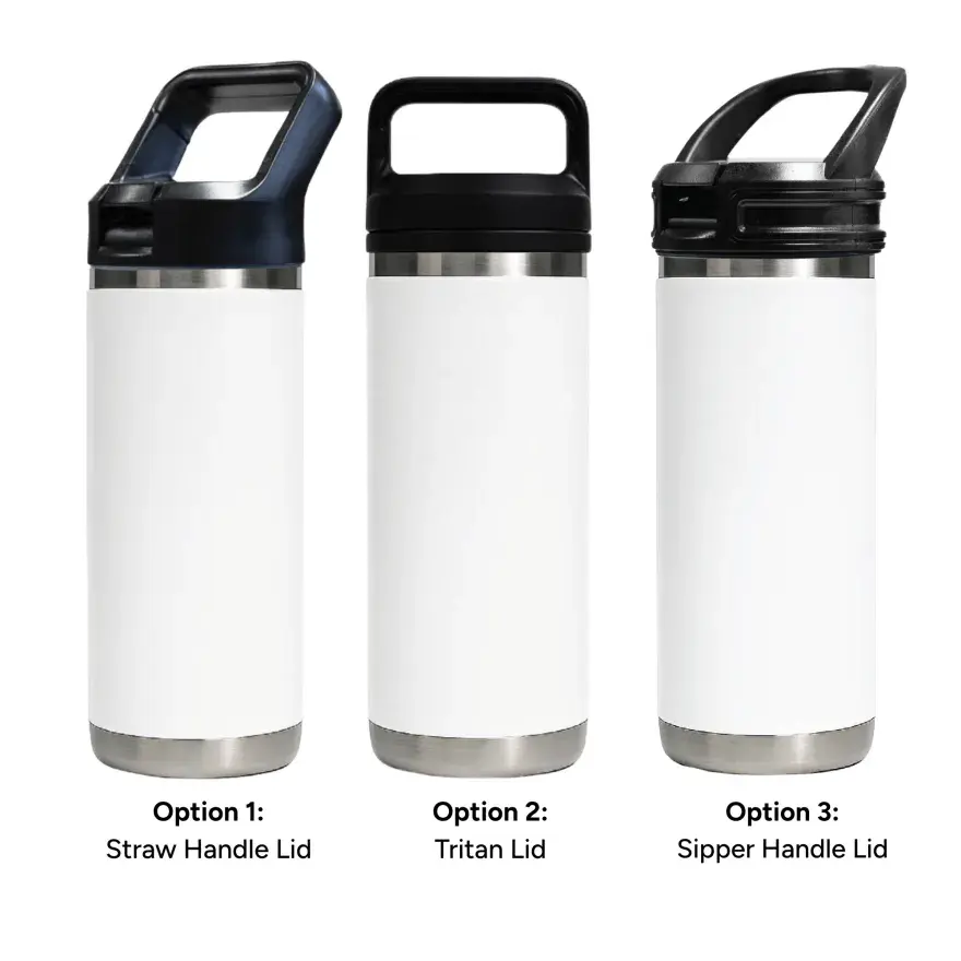532ml capacity for daily hydration. | Made from premium double-wall stainless steel (304 inside, 201 outside). | Vacuum insulation keeps drinks hot or cold for hours. | Leak-resistant seal for reliable, on-the-go use. | Available with 3 lid options – Straw Handle Lid (flip-up straw for easy sipping), Tritan Twist-On Lid (sturdy carry handle for portability), and Sipper Handle Lid (practical handle for effortless drinking).