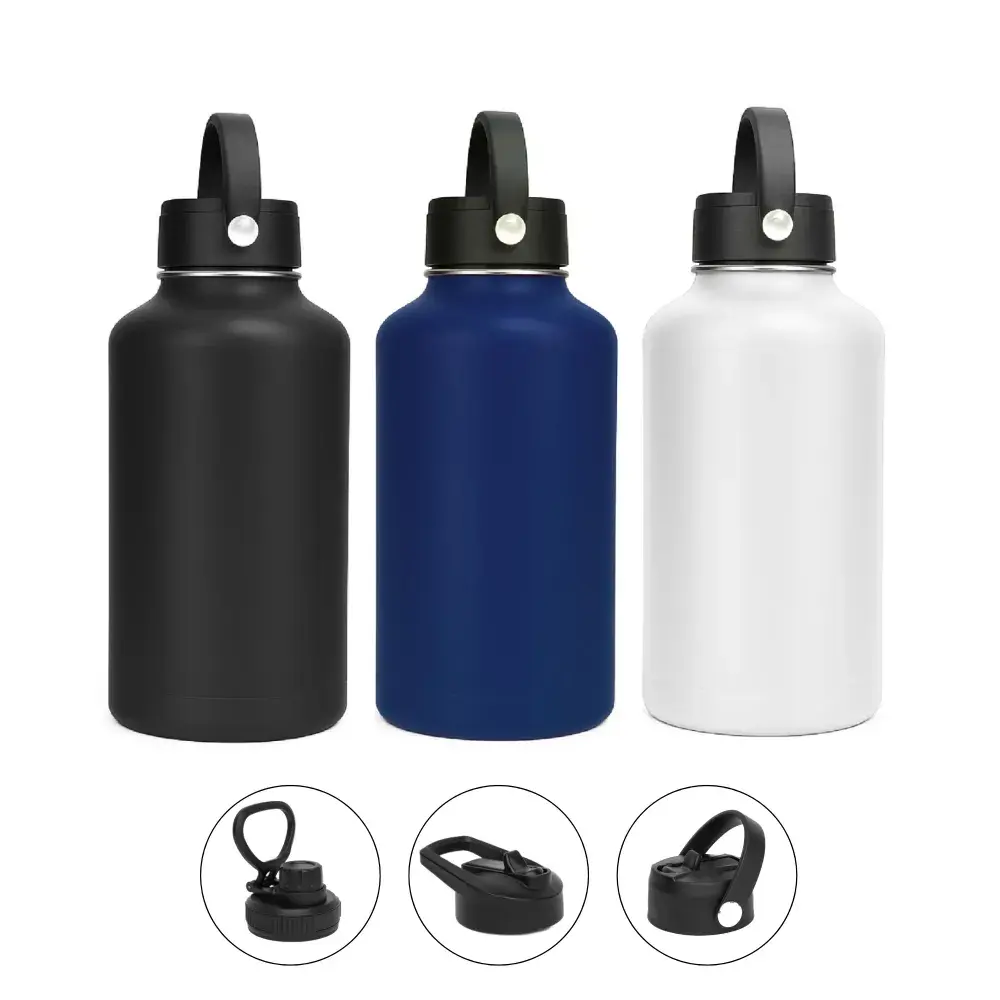 1800ml capacity for maximum hydration throughout the day. | Made from 304 stainless steel interior and 201 stainless steel exterior. | Double-wall vacuum insulation keeps drinks cold for 48hrs and hot for 12hrs. | Durable, rust-resistant, and BPA-free construction for safe daily use. | Sleek, ergonomic design for convenient portability. | Available with 3 lid options – Screw Cap Lid, Flip Top Lid, and Rotating Carry Handle Lid.
