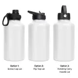 1800ml capacity for maximum hydration throughout the day. | Made from 304 stainless steel interior and 201 stainless steel exterior. | Double-wall vacuum insulation keeps drinks cold for 48hrs and hot for 12hrs. | Durable, rust-resistant, and BPA-free construction for safe daily use. | Sleek, ergonomic design for convenient portability. | Available with 3 lid options – Screw Cap Lid, Flip Top Lid, and Rotating Carry Handle Lid.