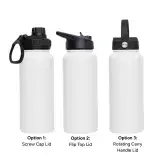 1L capacity for all-day hydration. | Made from 304 stainless steel interior and 201 stainless steel exterior. | Double-wall vacuum insulation keeps drinks cold for 48hrs and hot for 12hrs. | Durable, rust-resistant, and BPA-free construction for safe daily use. | Sleek, portable design fits easily in bags, desks, or cup holders. | Available with 3 lid options – Screw Cap Lid, Flip Top Lid, and Rotating Carry Handle Lid.