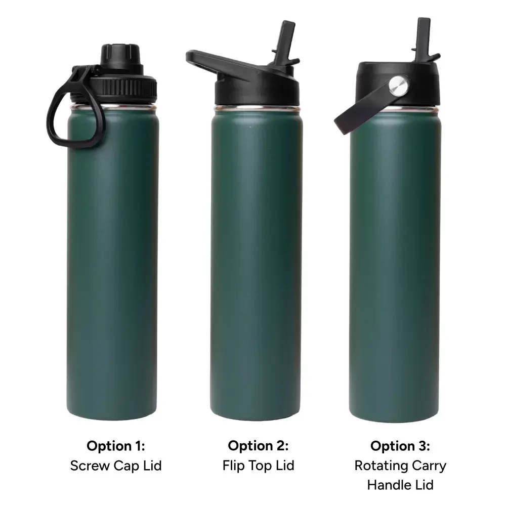 750ml capacity ideal for all-day hydration. | Made from 304 stainless steel interior and 201 stainless steel exterior. | Double-wall vacuum insulation keeps drinks cold for 48hrs and hot for 12hrs. | Durable, rust-resistant, and BPA-free for long-lasting, safe use. | Sleek, modern design fits easily in bags, desks, or cup holders. | Available with 3 lid options – Screw Cap Lid, Flip Top Lid, and Rotating Carry Handle Lid.
