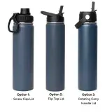 750ml capacity ideal for all-day hydration. | Made from 304 stainless steel interior and 201 stainless steel exterior. | Double-wall vacuum insulation keeps drinks cold for 48hrs and hot for 12hrs. | Durable, rust-resistant, and BPA-free for long-lasting, safe use. | Sleek, modern design fits easily in bags, desks, or cup holders. | Available with 3 lid options – Screw Cap Lid, Flip Top Lid, and Rotating Carry Handle Lid.