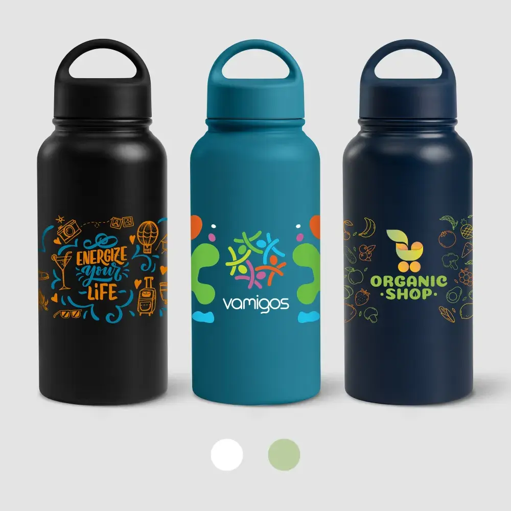 The Mariner - 915 ml Double Wall Stainless Steel Bottle is the ideal solution for businesses looking for high-quality, promotional items or corporate gifts. Crafted from recycled 304 stainless steel, both inside and out, this double-wall bottle with vacuum insulation ensures optimal temperature retention. It keeps beverages hot for up to 12 hours and cold for up to 24 hours, making it perfect for any occasion. The bottle features a matte finish with spray painting, adding a sleek and trendy touch. With a capacity of 915 ml. The PP lid ensures a secure fit, while the built-in handle offers convenience on the go. Note that this bottle is not suitable for dishwashers or microwaves. Packaged in a polybag, the Mariner bottle is a stylish and practical choice for everyday use, corporate events, client gifts, and promotional giveaways.