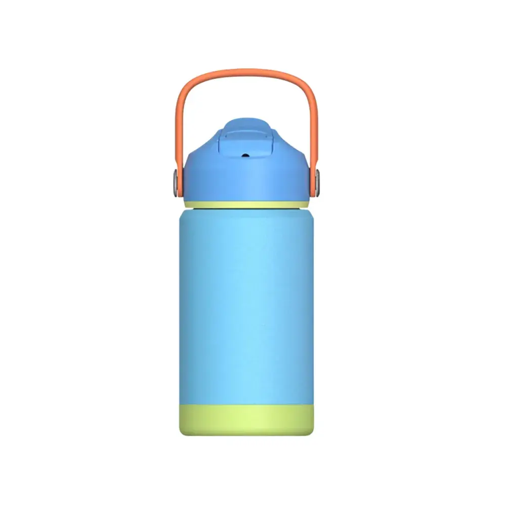 Made from durable 304 stainless steel with protective silicone base. | Foldable straw lid for easy, spill-free drinking. | Double-wall insulation keeps drinks hot or cold for 6–10 hours. | 350ml capacity – ideal for kids. | Rotary digital print for vibrant logo display. | Perfect for school, recess, and sports games.