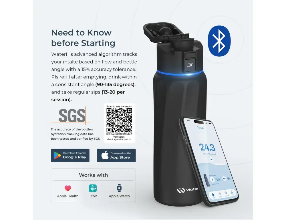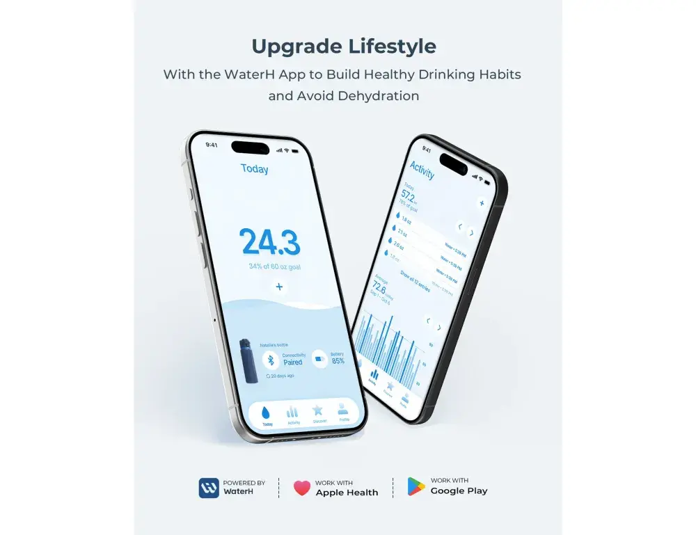 Pair with iOS or Android devices to view real-time data, review historical hydration insights, and sync with health platforms like Apple Health or Fitbit for holistic wellness tracking. Download the app from the App Store for iOS or the Play Store for Android.