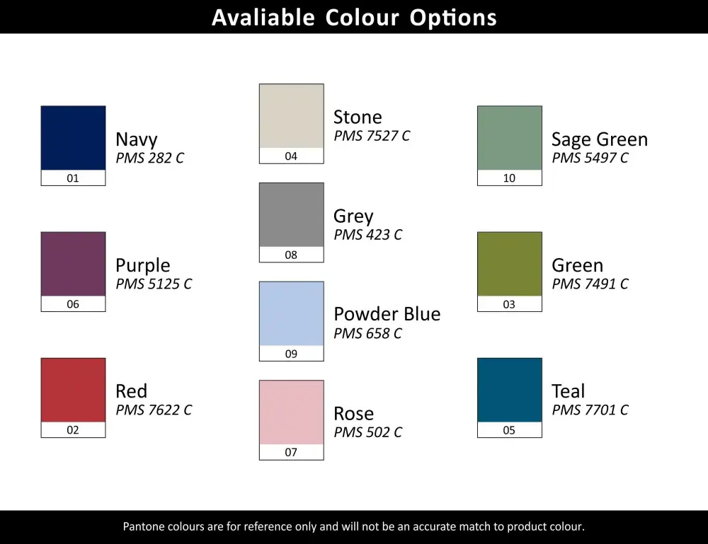 Navy, Stone, Sage Green, Purple, Grey, Green, Red, Powder Blue, Rose, Teal