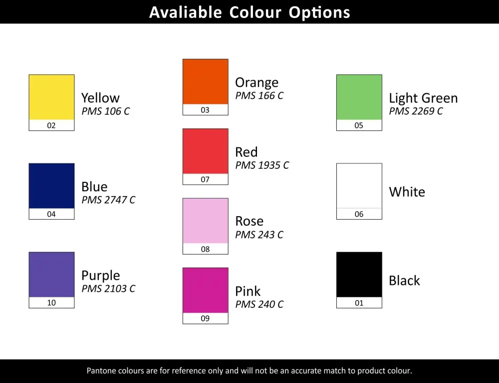 Yellow, Orange, Light Green, Blue, Red, White, Purple, Rose, Pink, Black