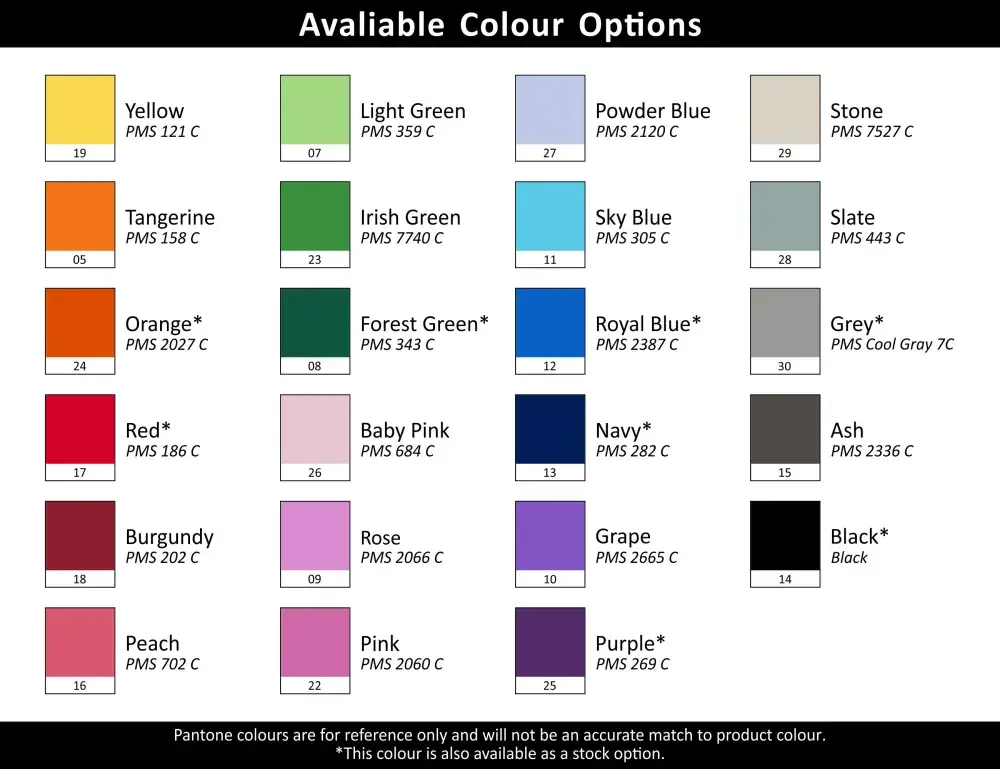 Yellow, Light Green, Powder Blue, Stone, Tangerine, Irish Green, Sky Blue, Slate, Orange, Forest Green, Royal Blue, Grey, Red, Baby Pink, Navy, Ash, Burgundy, Rose, Grape, Black, Peach, Pink, Purple