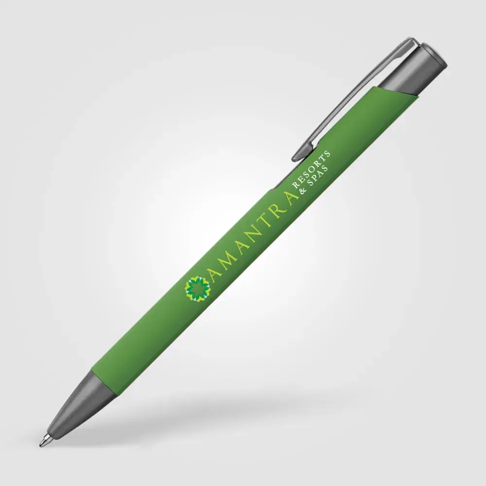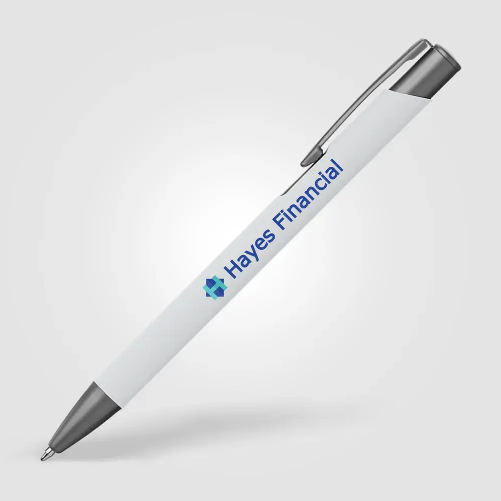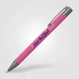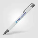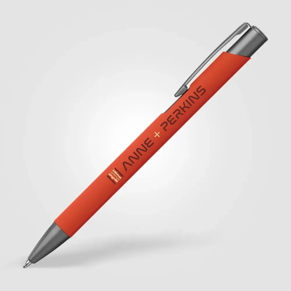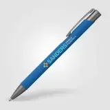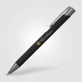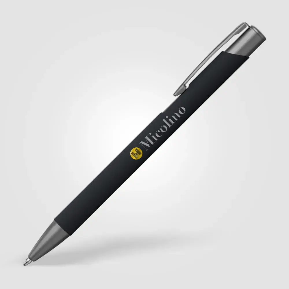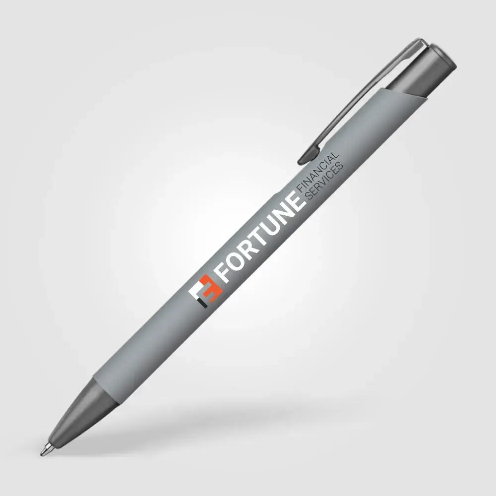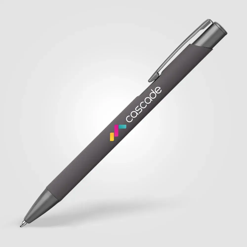 Tactile soft-touch ballpoint pen with rubberised aluminium barrel and gunmetal trim. Supplied with a premium Eversmooth elite German ink refill with a choice of blue or black writing ink.
