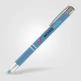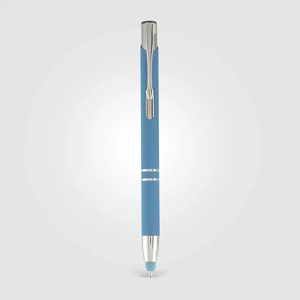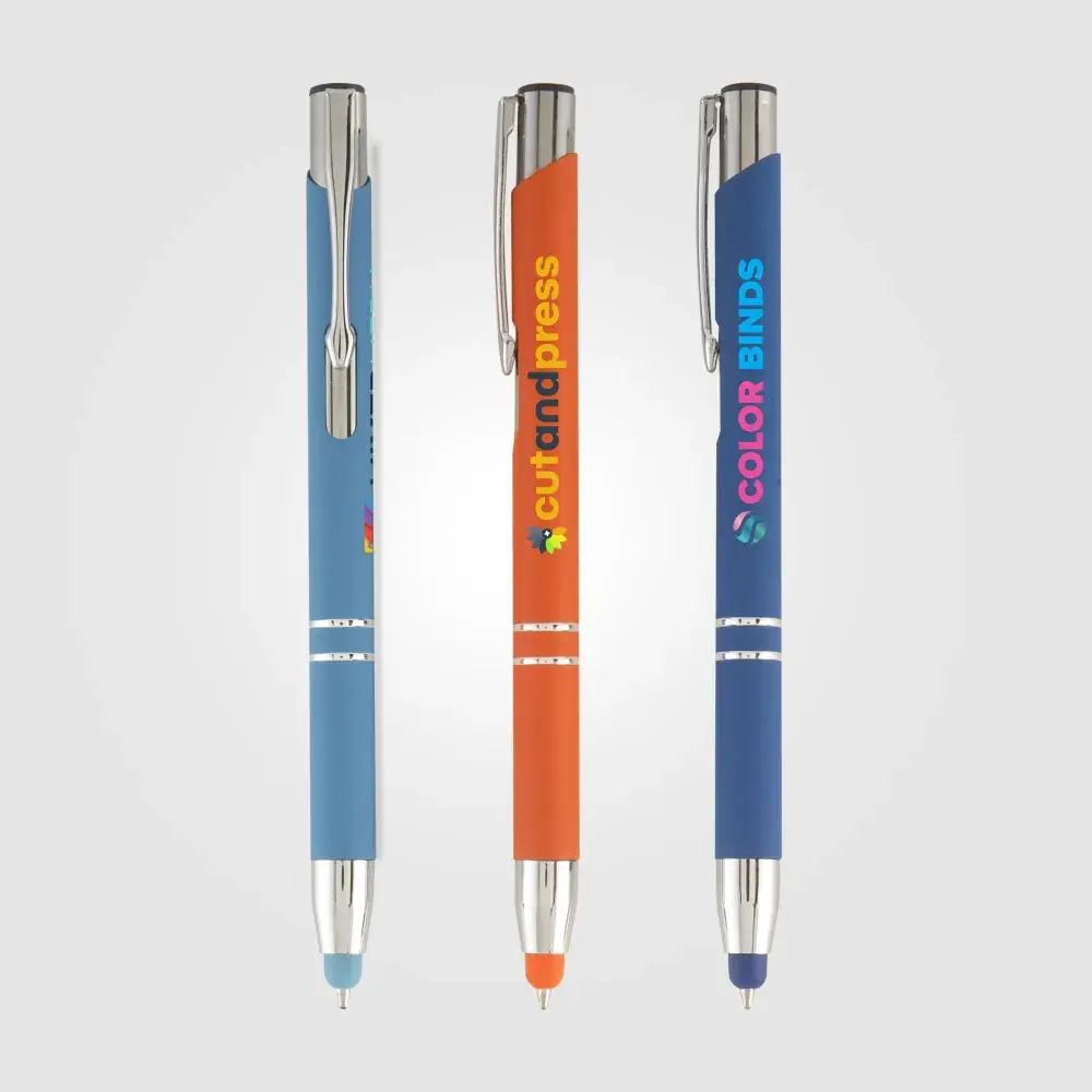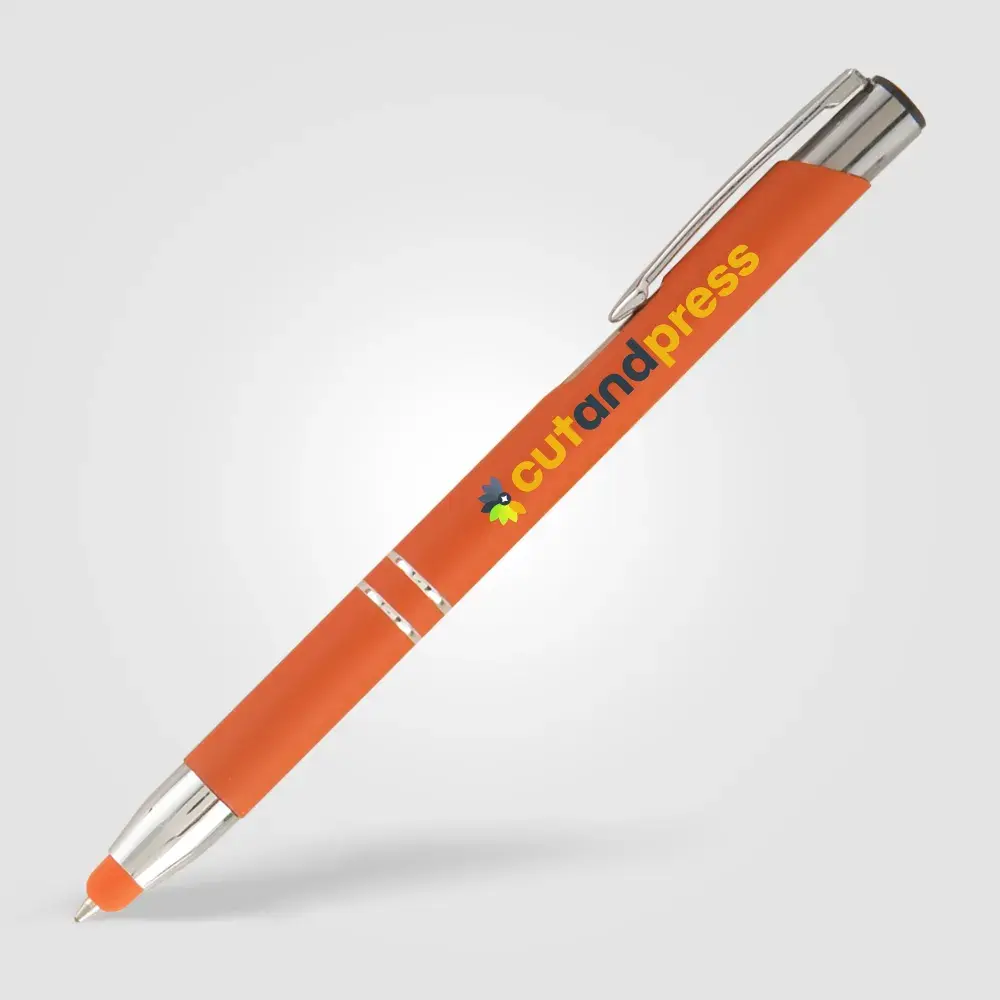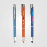 Best-selling, dual function soft touch metal ballpoint pen with silicone tip stylus to the nib. Choice of blue or black writing ink. Available in bright barrel colours with shiny chrome trim.