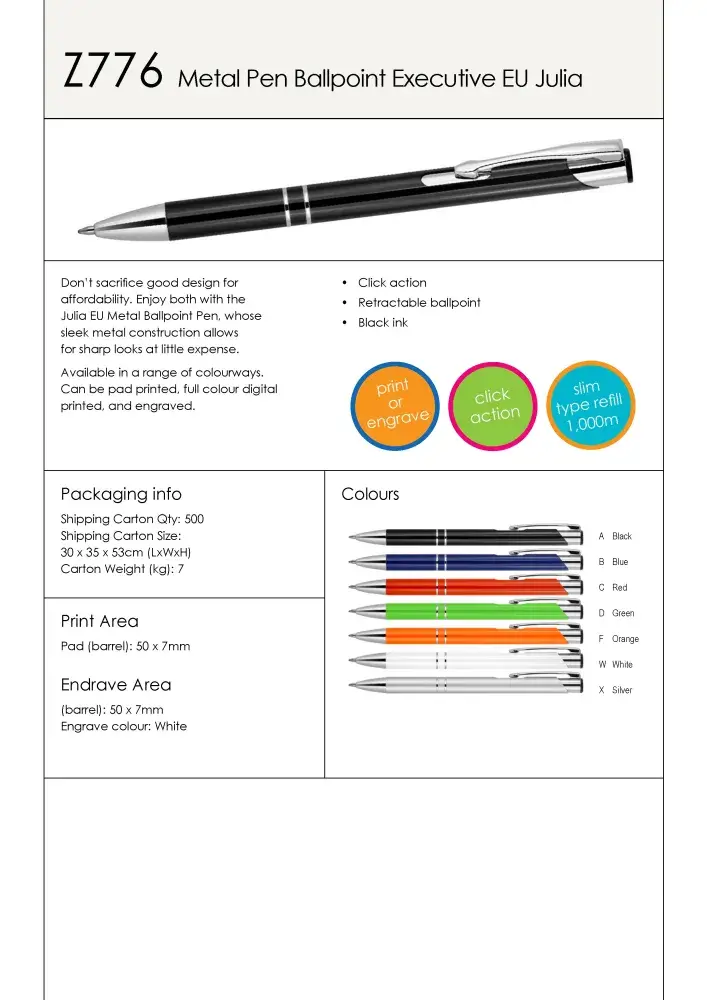 Don't sacrifice good design for affordability. Enjoy both with the Julia EU Metal Ballpoint Pen, whose sleek metal construction allows for sharp looks at little expense. Available in a range of colourways. Can be pad printed, full colour digital printed, and engraved.