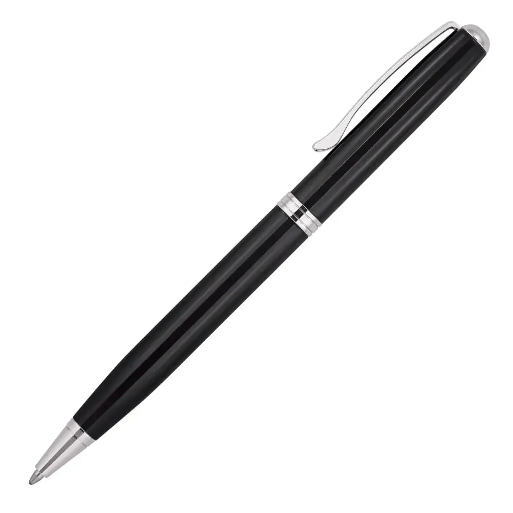 The slick and stylish design of the Eva Metal Ballpoint Pen makes a perfect corporate gift idea that is sure to impress. Engineered with a quality, twist action, retractable, 1.0mm ballpoint nib, this chrome trim, black ink pen has a reliable Parker type refill - German ink - 4,000m. A perfect option for personalisation with a pad printed or laser engraved logo.