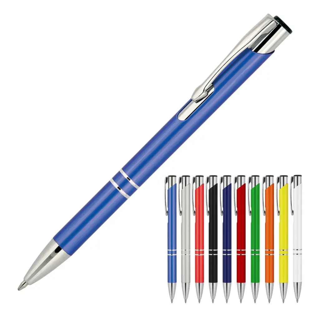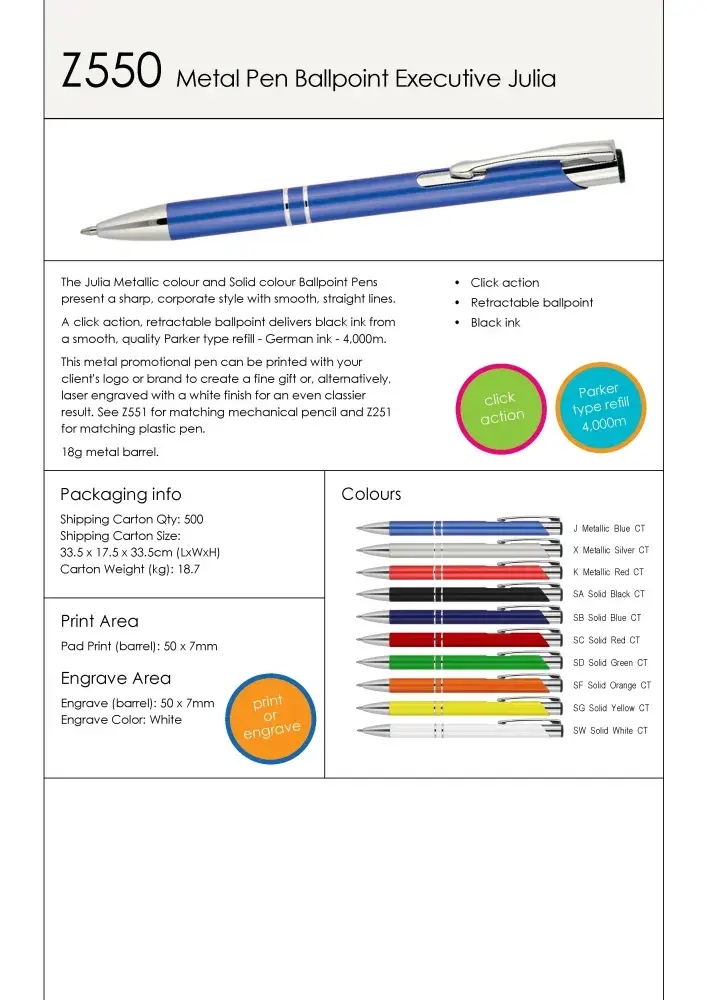 The Julia Solid and Metallic Metal Ballpoint Pens present a sharp, corporate style with smooth, straight lines. A click action, retractable ballpoint delivers black ink from a smooth, quality Parker type refill - German ink - 4,000m. This metal promotional pen can be printed with your client's logo or brand to create a fine gift or, alternatively, laser engraved with a white finish for an even classier result. See Z551 for matching mechanical pencil and Z251 for matching plastic pen. 18g metal barrel.