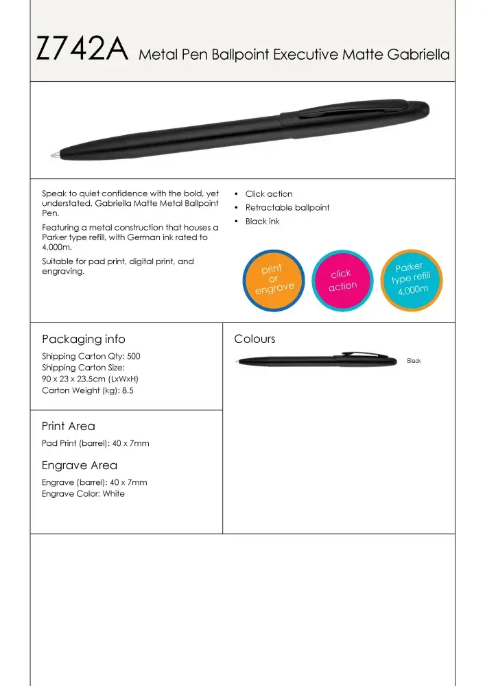 Speak to quiet confidence with the bold, yet understated, Gabriella Matte Metal Ballpoint Pen. Featuring a metal construction that houses a Parker type refill, with German ink rated to 4,000m. Suitable for pad print, digital print, and engraving.