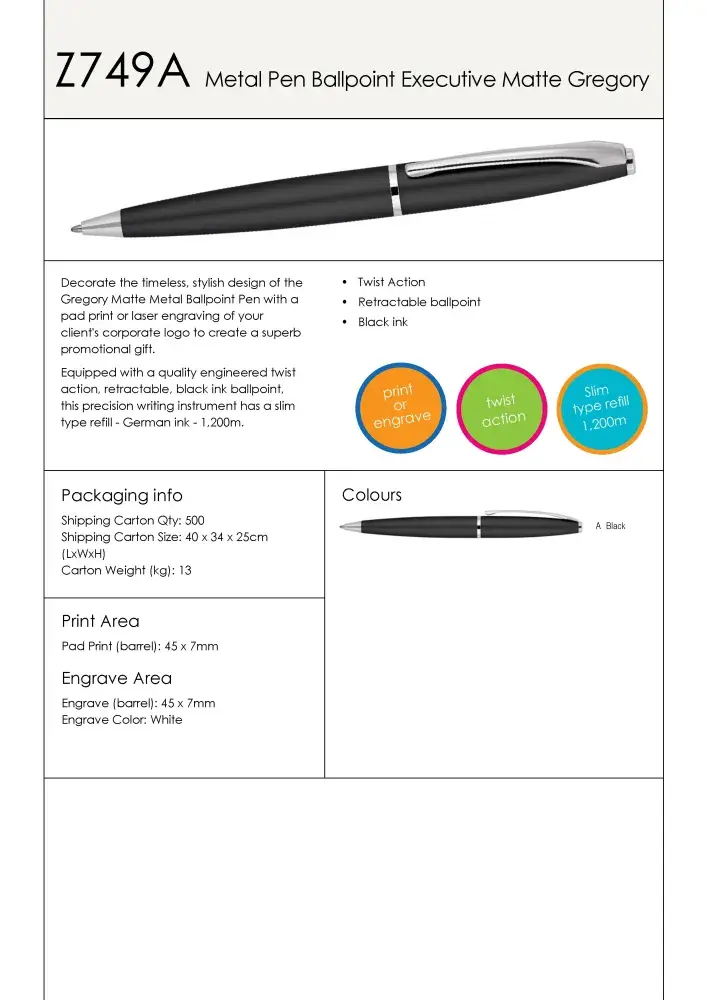 Decorate the timeless, stylish design of the Gregory Matte Metal Ballpoint Pen with a pad print or laser engraving of your client's corporate logo to create a superb promotional gift. Equipped with a quality engineered twist action, retractable, black ink ballpoint, this precision writing instrument has a slim type refill - German ink - 1,200m.