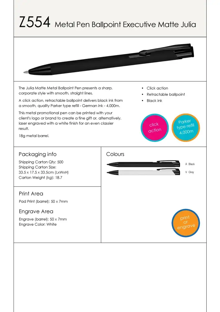 The Julia Matte Metal Ballpoint Pen presents a sharp, corporate style with smooth, straight lines. A click action, retractable ballpoint delivers black ink from a smooth, quality Parker type refill - German ink - 4,000m. This metal promotional pen can be printed with your client's logo or brand to create a fine gift or, alternatively, laser engraved with a white finish for an even classier result. 18g metal barrel.