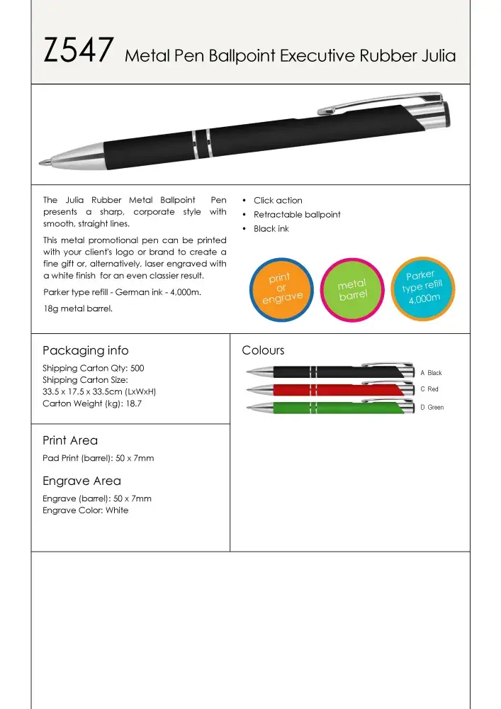 The Julia Rubber Metal Ballpoint Pen presents a sharp, corporate style with smooth, straight lines. This metal promotional pen can be printed with your client's logo or brand to create a fine gift or, alternatively, laser engraved with a white finish for an even classier result. Parker type refill - German ink - 4,000m. 18g metal barrel.