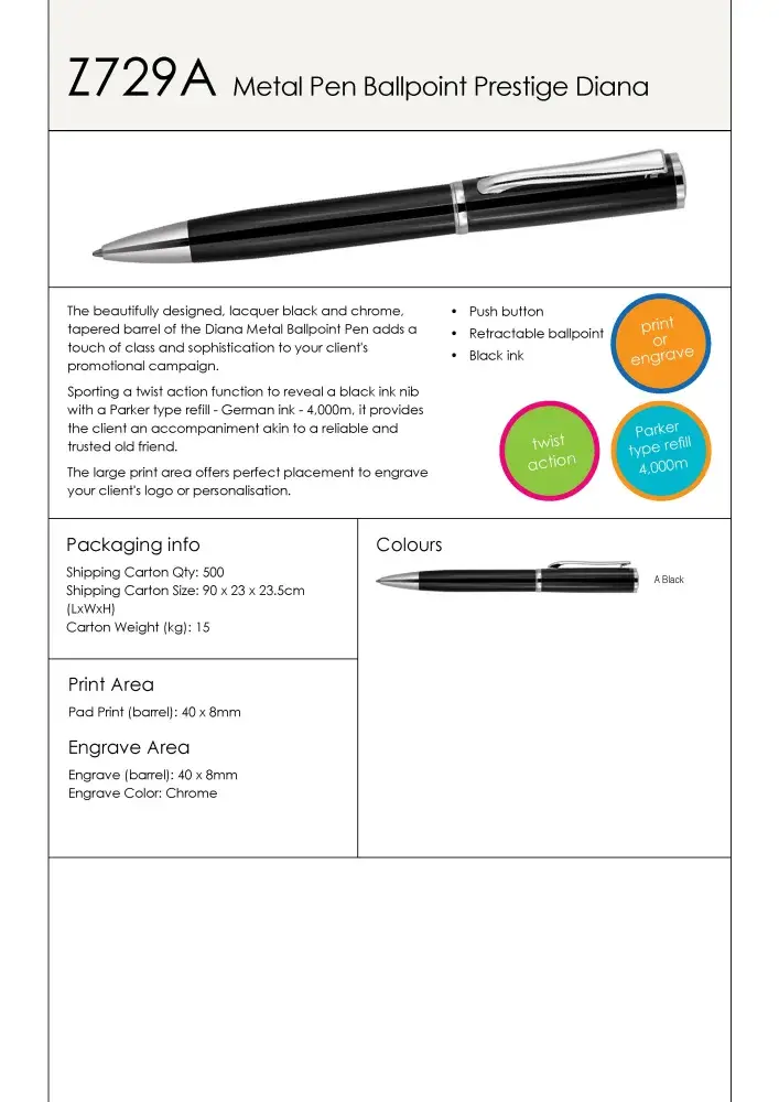The beautifully designed, lacquer black and chrome, tapered barrel of the Diana Metal Ballpoint Pen adds a touch of class and sophistication to your client's promotional campaign. Sporting a twist action function to reveal a black ink nib with a Parker type refill - German ink - 4,000m, it provides the client an accompaniment akin to a reliable and trusted old friend. The large print area offers perfect placement to engrave your client's logo or personalisation.