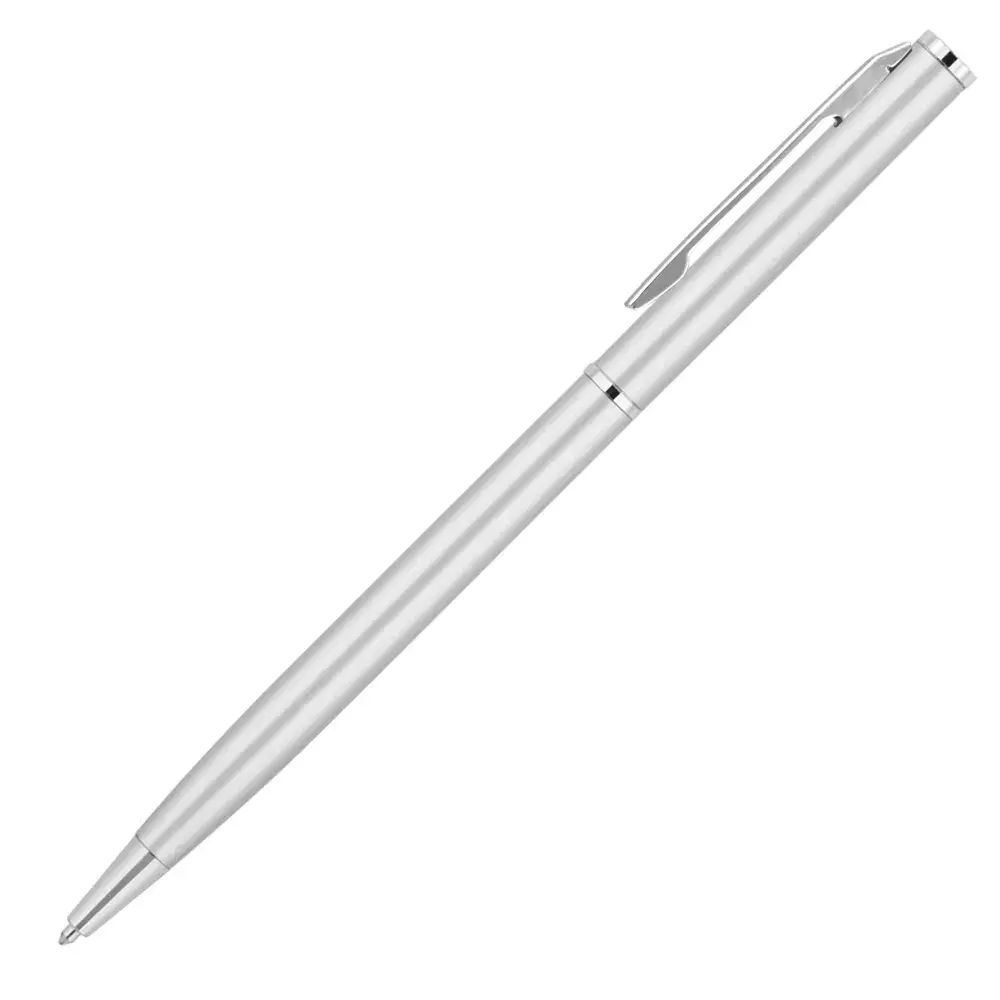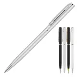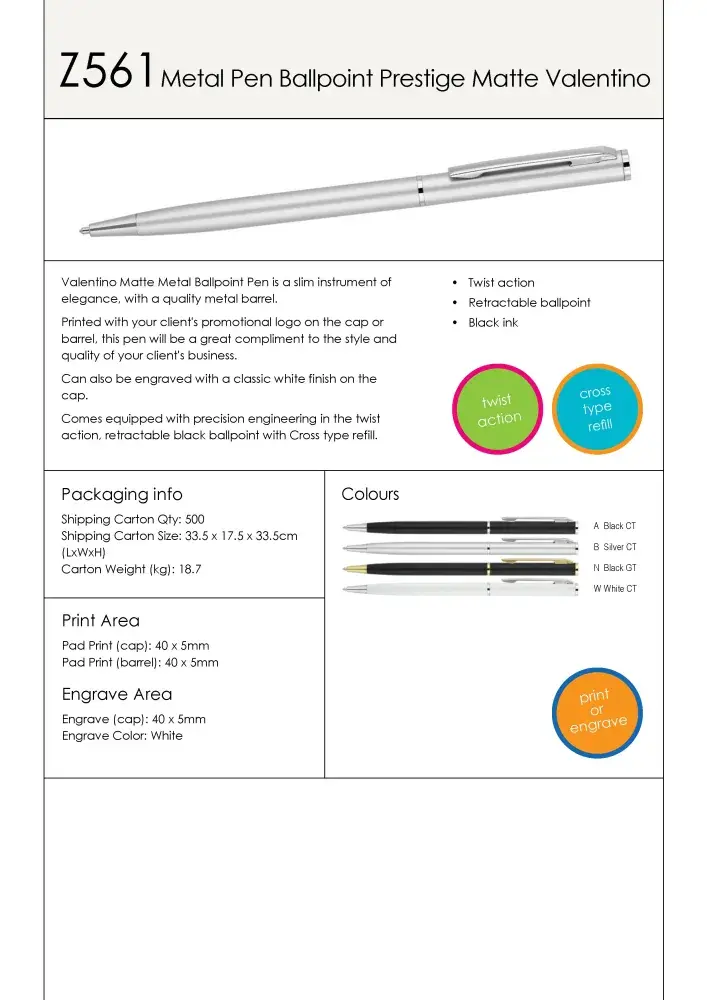 Valentino Matte Metal Ballpoint Pen is a slim instrument of elegance, with a quality metal barrel. Printed with your client's promotional logo on the cap or barrel, this pen will be a great compliment to the style and quality of your client's business. Can also be engraved with a classic white finish on the cap. Comes equipped with precision engineering in the twist action, retractable black ballpoint with Cross type refill.