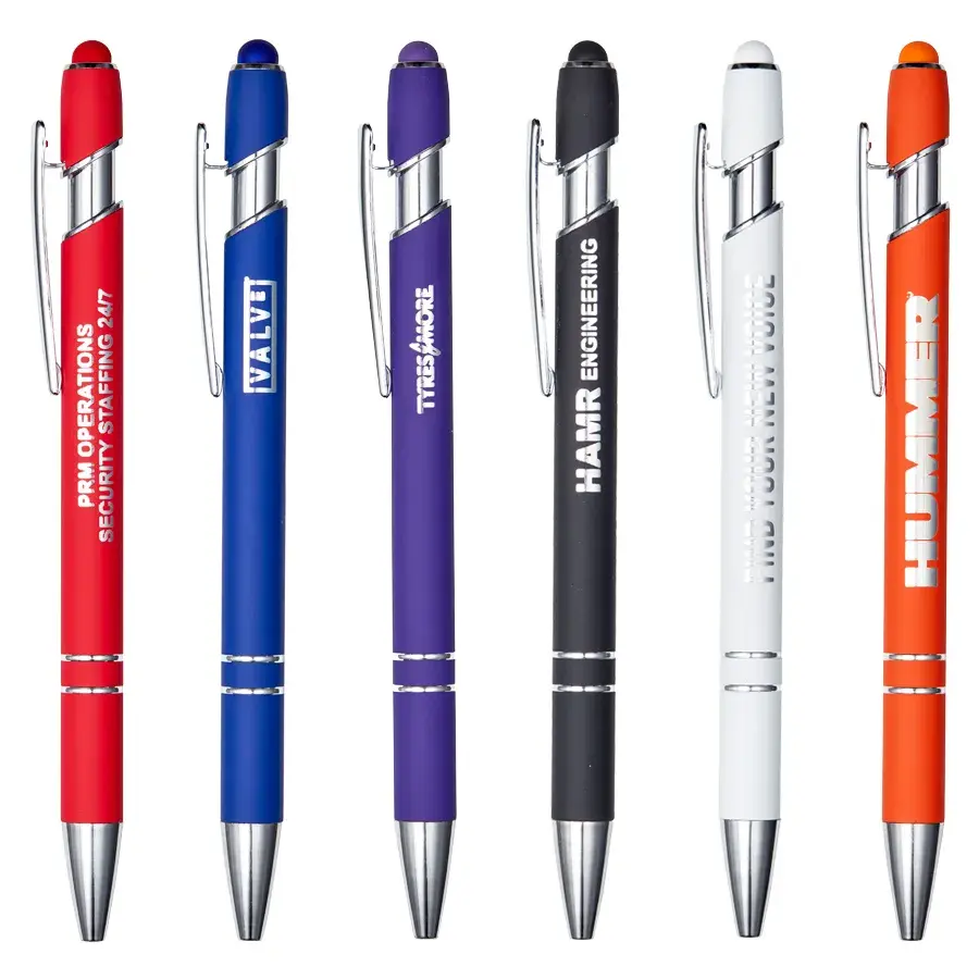 Click action metal pen with unique rubberised finish comes with black ink. Pen features matching stylus tip. Each pen engraves to expose a stunning matte finish.