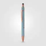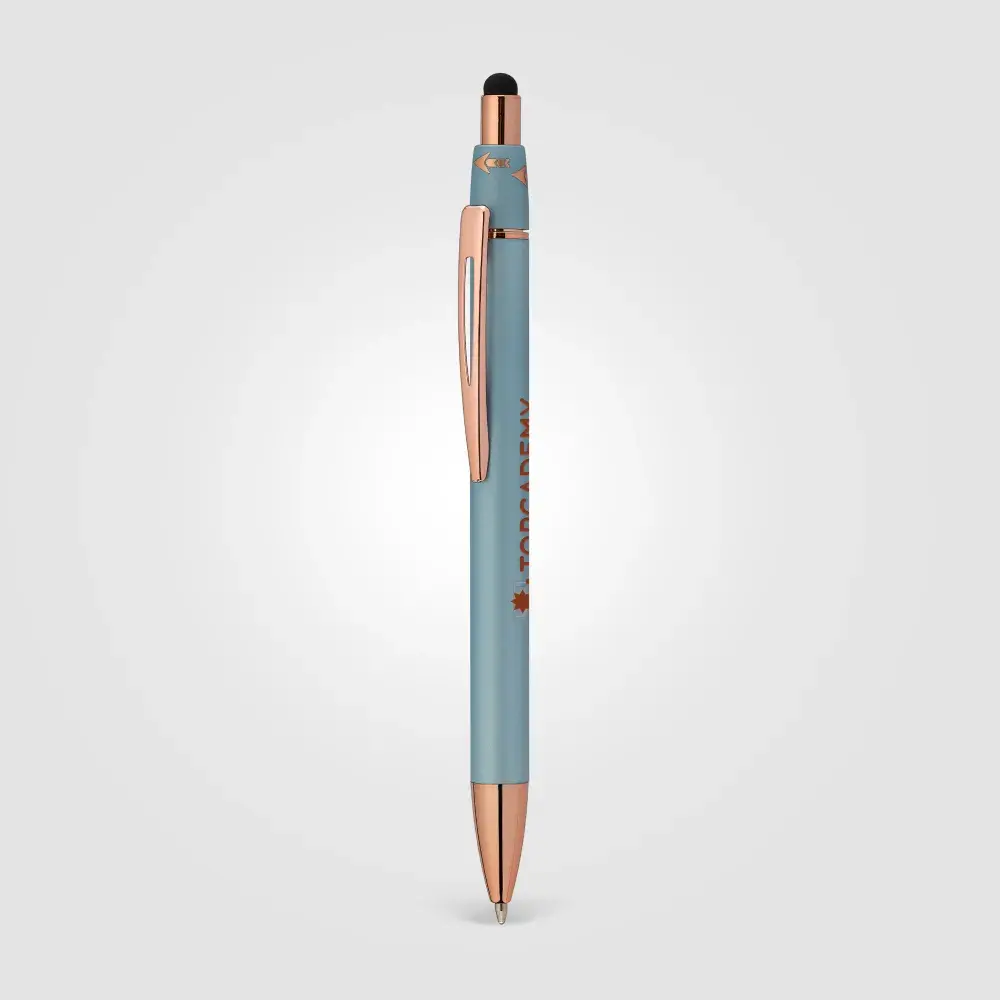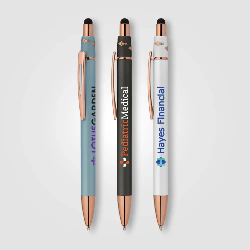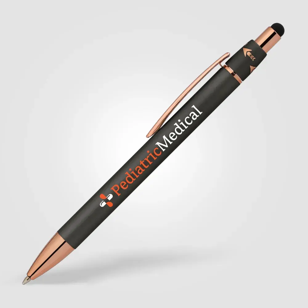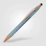 Introducing our new Orbit Spinner Metal Pen w/Stylus, a perfect blend of tradition and innovation. With a retractable Aluminium barrel and a rotating fixture adorned with rose gold arrows activated by a simple thumb push, it offers a unique writing experience. The luxurious rubber paint finish and rose gold trim add elegance. Seamlessly transition between paper and digital interfaces with the black stylus. The spinning portion, adorned with rose gold arrows, enhances both visual appeal and tactile experience.