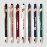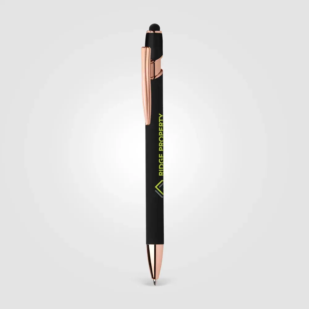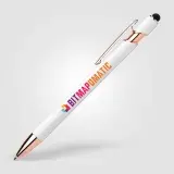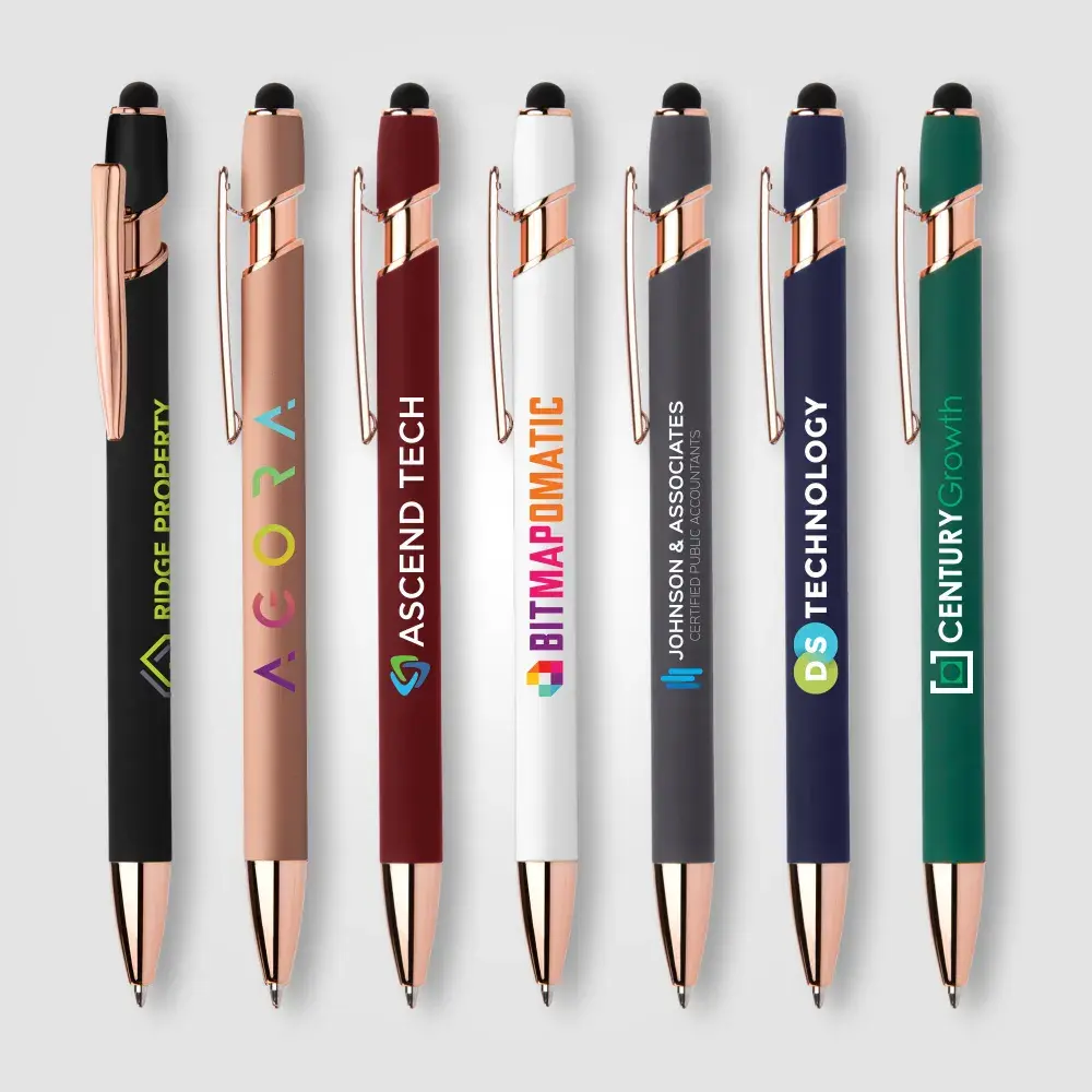 The Prince Softy Rose Gold w/ Stylus is a stylish, premium pen with trendy rose gold trim, available in your choice of black or blue medium ballpoint ink. Available in a range of top-selling classic barrel colours, all with rubberized soft touch finish plus a stylus that's perfect for touchscreens. Our precise silver laser engraving will showcase your company name, logo or advertising information. This beautiful promotional pen will be a favourite of your customers!