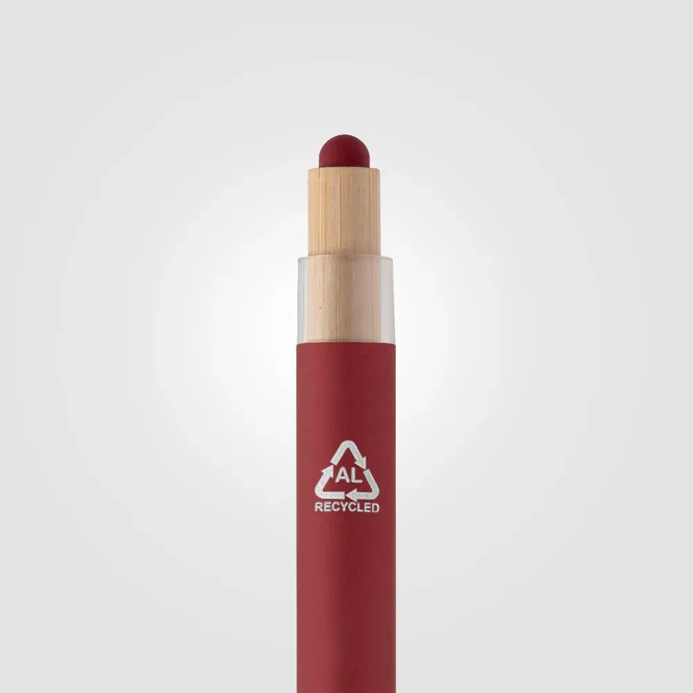 The Reborn Recycled Aluminium Stylus Pen features a 100% recycled aluminium barrel with a satin rubber-painted finish for a sleek, modern look. The barrel is accented with clear PET plastic at the top and a bamboo plunger with a colour-matching stylus for added functionality. The steel clip is finished in gunmetal for a stylish contrast, and a recycled aluminium symbol is laser engraved on the opposite side of the clip. With a slim plastic refill and Dokumental ink, it offers a smooth, consistent 900m write-out with a 1.0mm tip.
