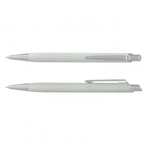 Retractable aluminium ballpoint pen with a unique stone-like textured finish and shiny chrome accents. It has a blue large volume refill with 1800 metres of writing ink and can be presented in an optional pen sleeve.