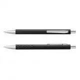 Retractable aluminium ballpoint pen with a debossed pattern on the grip, a matte lacquered barrel and shiny chrome accents. It has a blue large volume refill with 800 metres of writing ink and can be presented in an optional black pen sleeve.