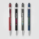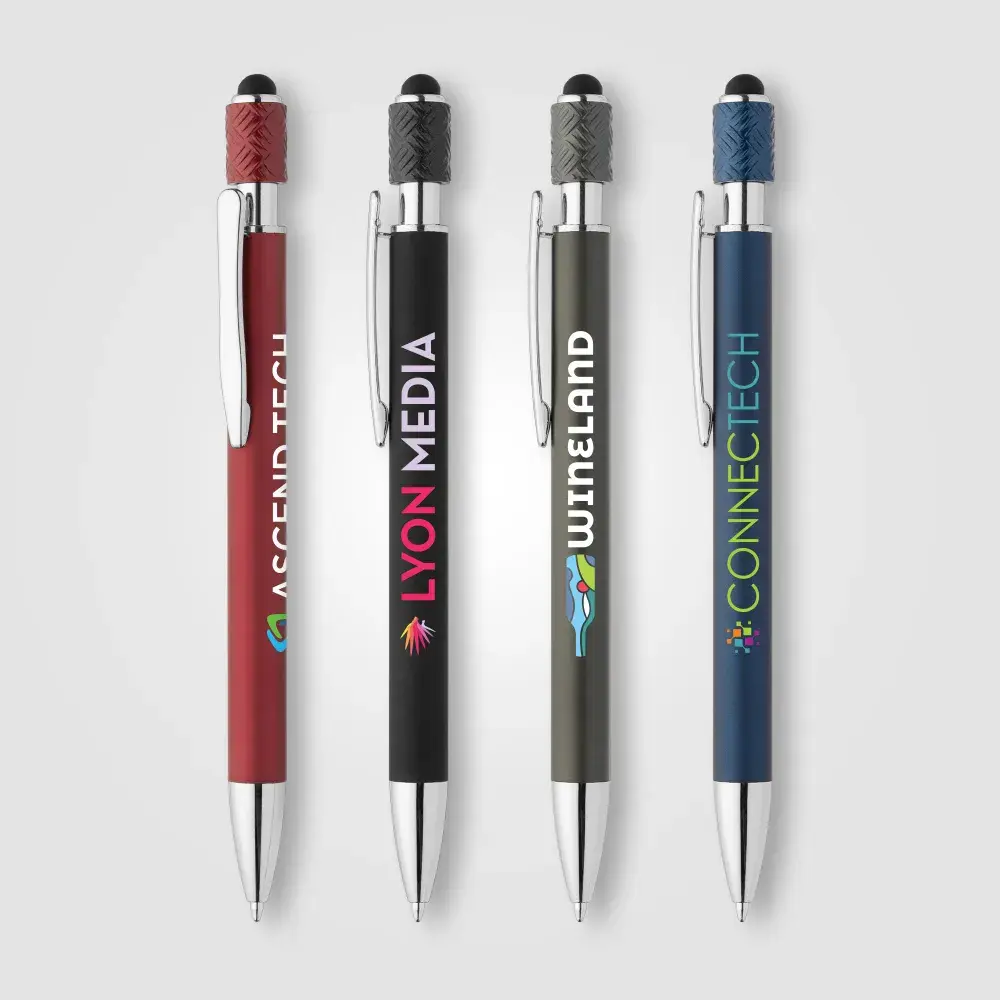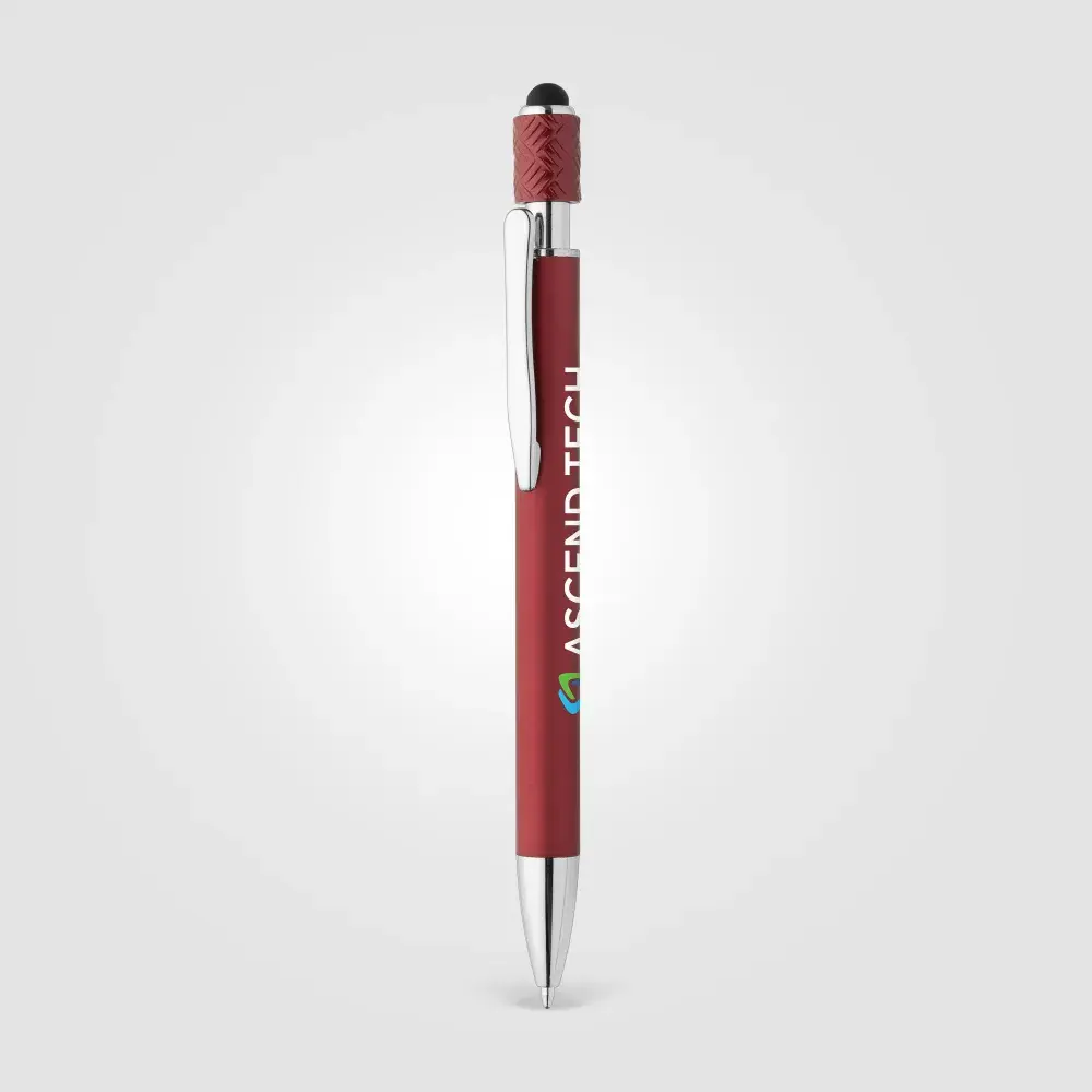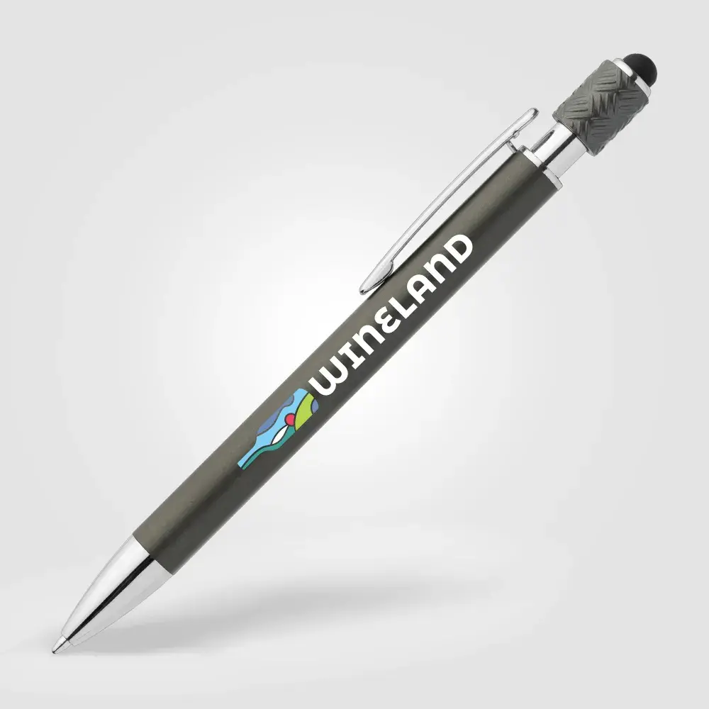 Designed for both function and fun, the Wave Aluminium Spinner Stylus Penfeatures a retractable aluminium barrel with a soft-touch rubber-painted finish for a comfortable grip. The unique rotating fixture on top allows the pen to spin effortlessly with a simple push of the thumb, offering an engaging fidget experience. The spinner section, made of ABS plastic, is textured with a chevron pattern and finished in metallic paint for added flair. The sleek chrome trim and black stylus on the plunger provide a polished, modern look. Equipped with a slim 1.0mm Dokumental Ink refill, it delivers a smooth 500m write-out for precise, reliable writing.