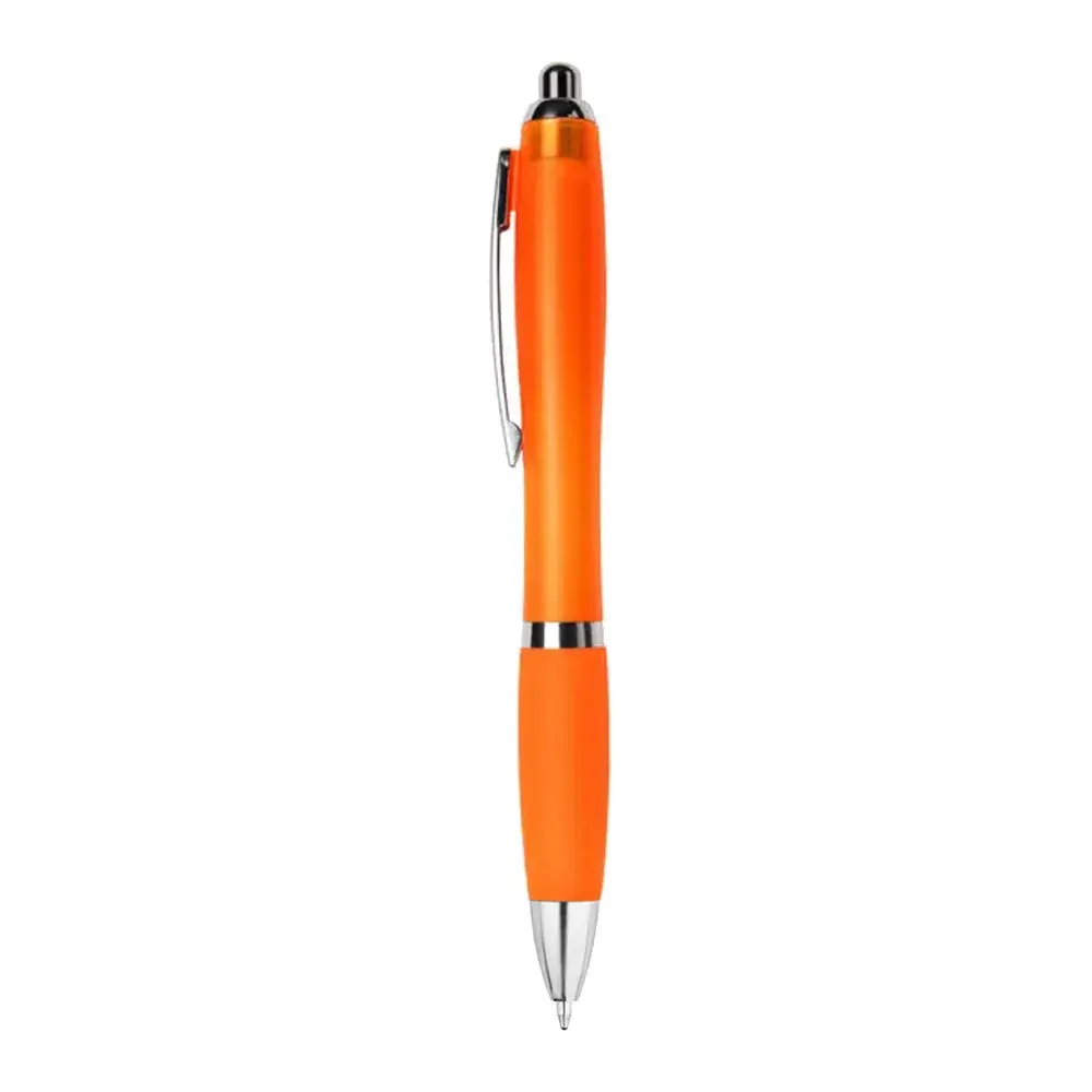 Click action plastic pen with translucent barrel and rubberized soft-touch grip shiny silver chrome trim and metal clip one of most popular promotional pens. It has high quality Parker-Type German manufactured black ink refill 1800 meters writing distance tungsten carbide ball provides you with quality writing. Comes standard with black ink but blue ink is available on request.