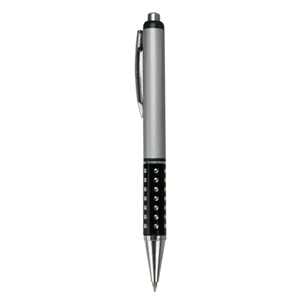 Click action plastic pen matt silver body with coloured silver dotty grip and shiny silver chrome fittings high quality German manufactured black ink refill 1800 meters writing distance tungsten carbide ball provides you with quality writing.