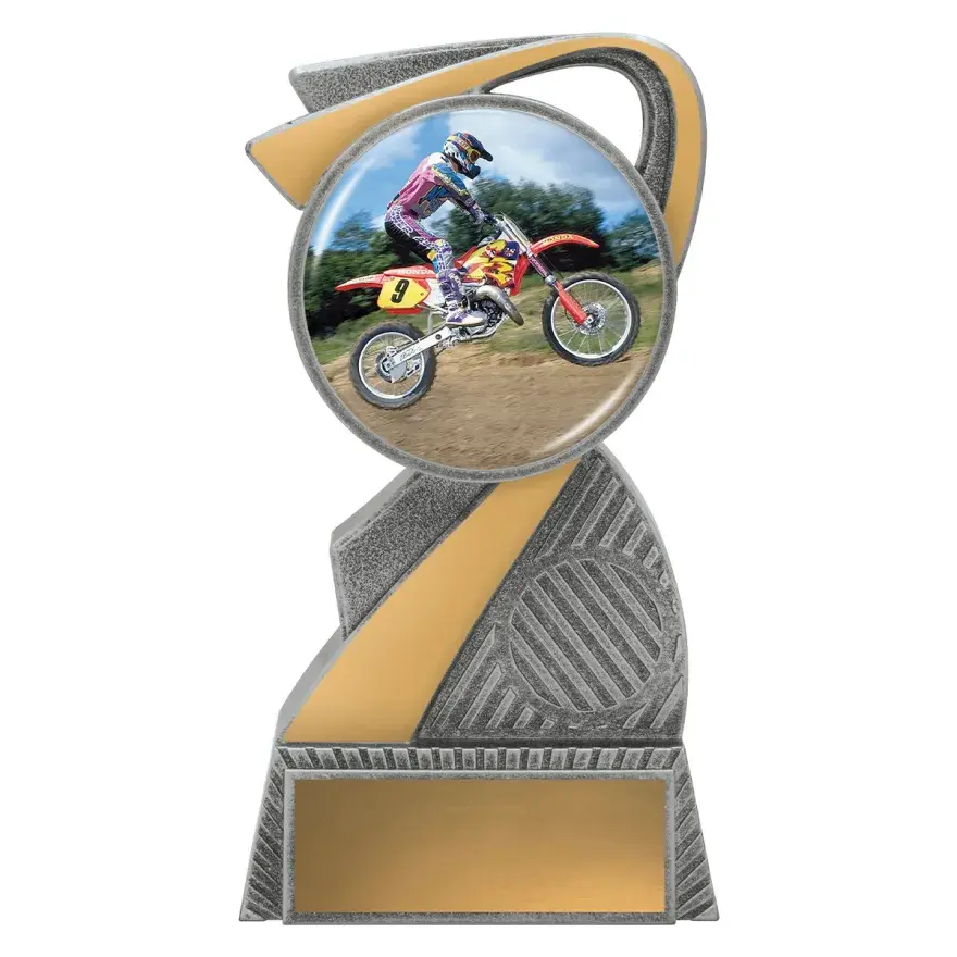Dynamic Motocross trophies well suited to range of events. These 'Flag' bike trophies feature a stylish star based design with a rider in action.