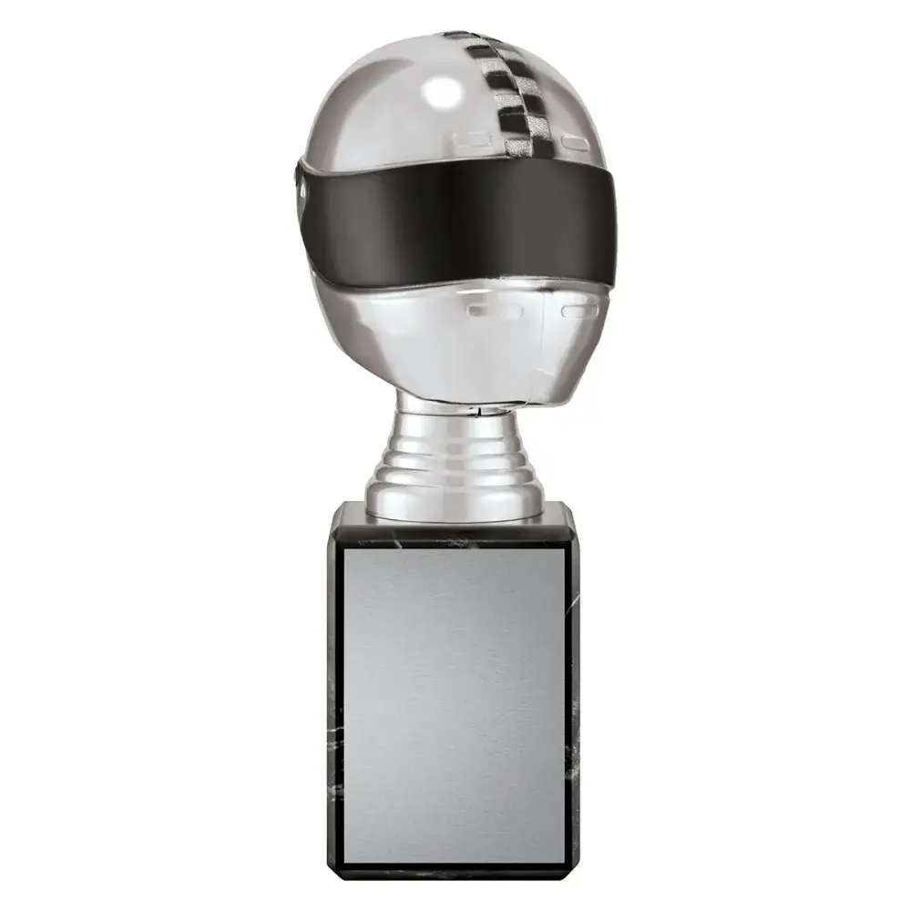 Premium marble tower blocks with outstanding 3D motorsport helmet finished in bright silver - space for personalisation and extra weight for your awards.