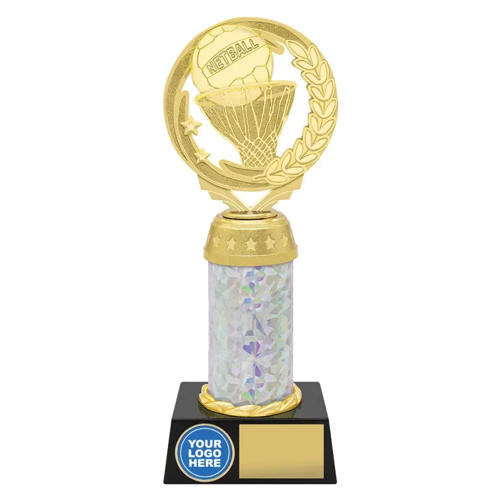 Brilliant netball trophies feature wreath inspired top in bright trophy gold atop columns and a base for your club logo. Choose colour of column to suit.