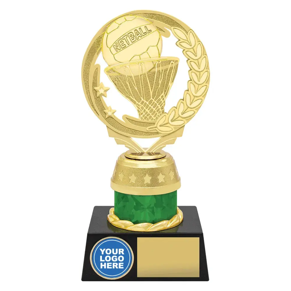 Brilliant netball trophies feature wreath inspired top in bright trophy gold atop columns and a base for your club logo. Choose colour of column to suit.