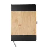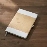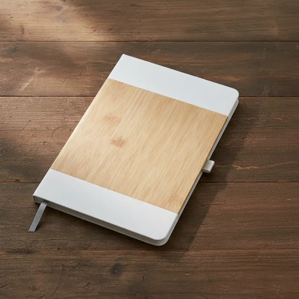 Capture your ideas in style with this eco-friendly A5 notebook, featuring a natural bamboo cover paired with sleek white accents for a modern, sustainable look. Designed for both practicality and branding appeal, it includes a matching elastic pen loop and ribbon marker for easy organization. Inside, smooth lined pages provide the perfect space for planning and creative inspiration. Ideal for corporate gifting, conferences, or personal use, this notebook combines sustainability with timeless simplicity.