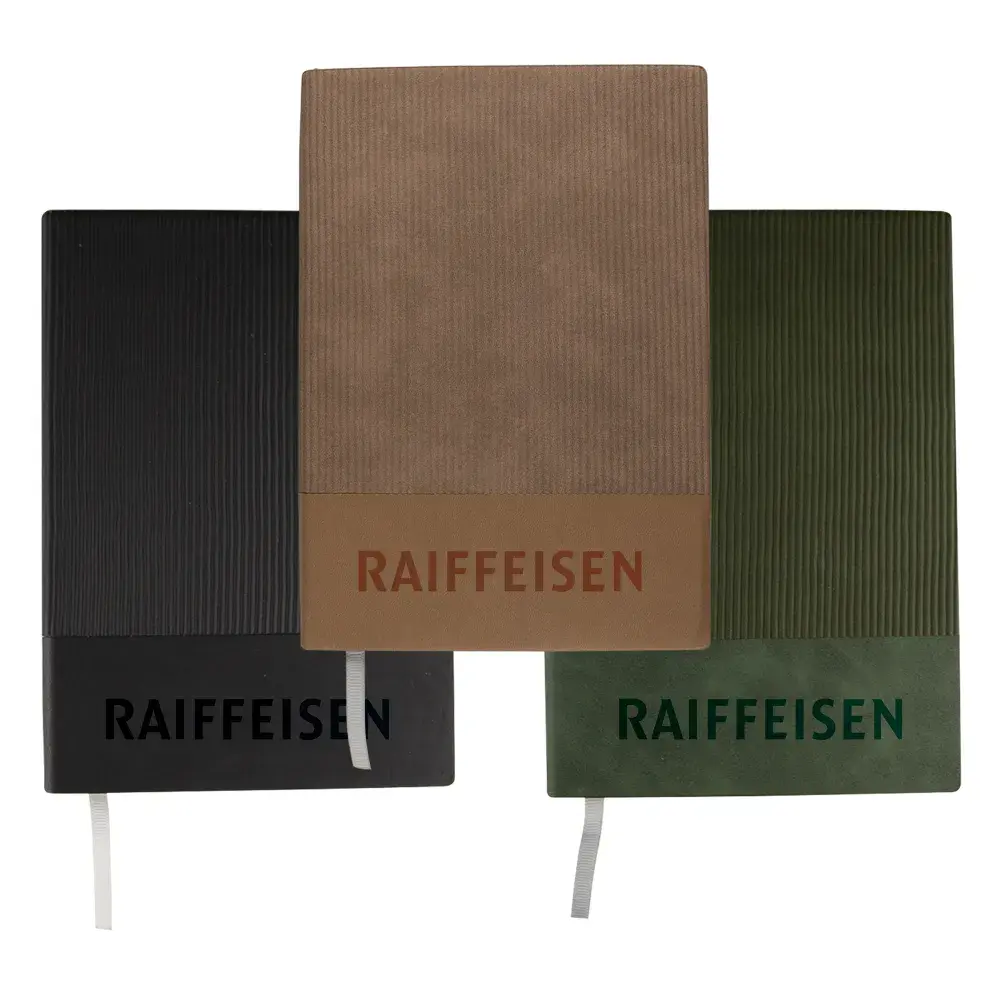 Elevate your everyday notes with the Murcia Notebook B5. Designed with a sleek, two-tone cover, it blends modern elegance with practical durability. The soft-touch PU leather exterior offers a refined look and feel, while the ribbed texture adds a touch of understated style. Inside, high-quality 8mm lined paper provides a smooth writing surface, perfect for journaling, meetings, or daily planning. Finished with a matching grey ribbon bookmark, this notebook makes a professional and sustainable choice for gifting or branding.