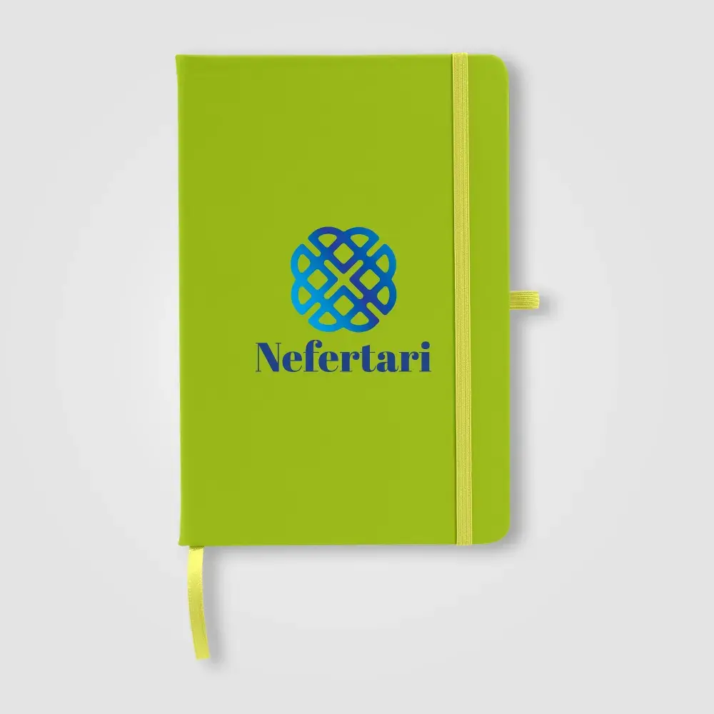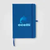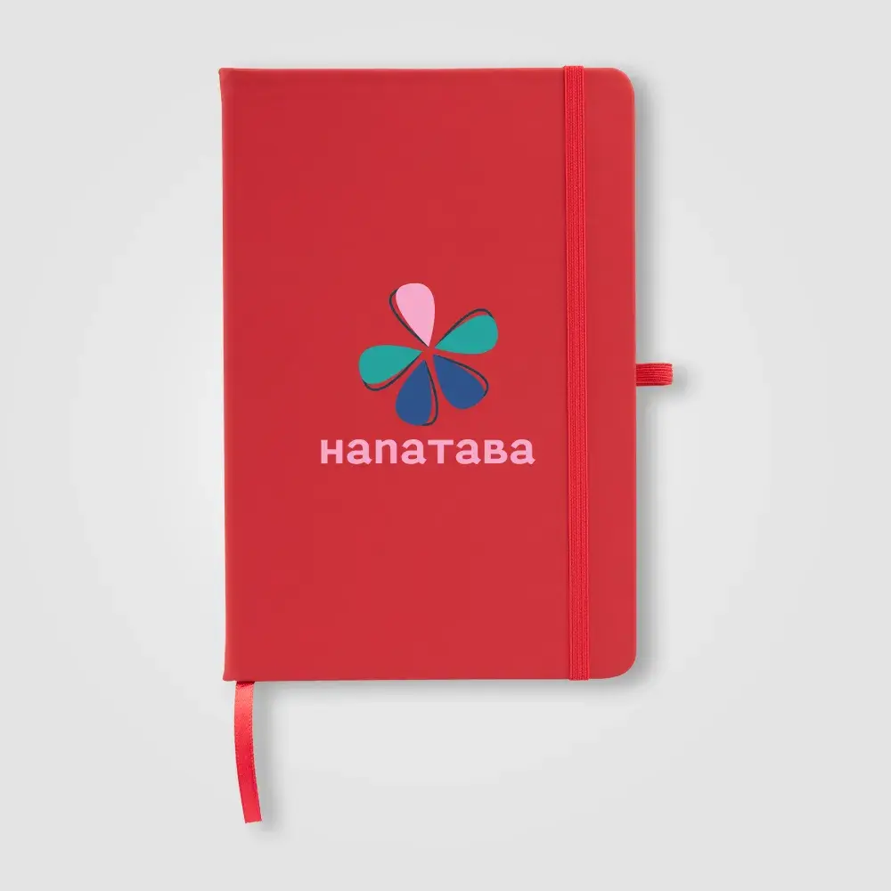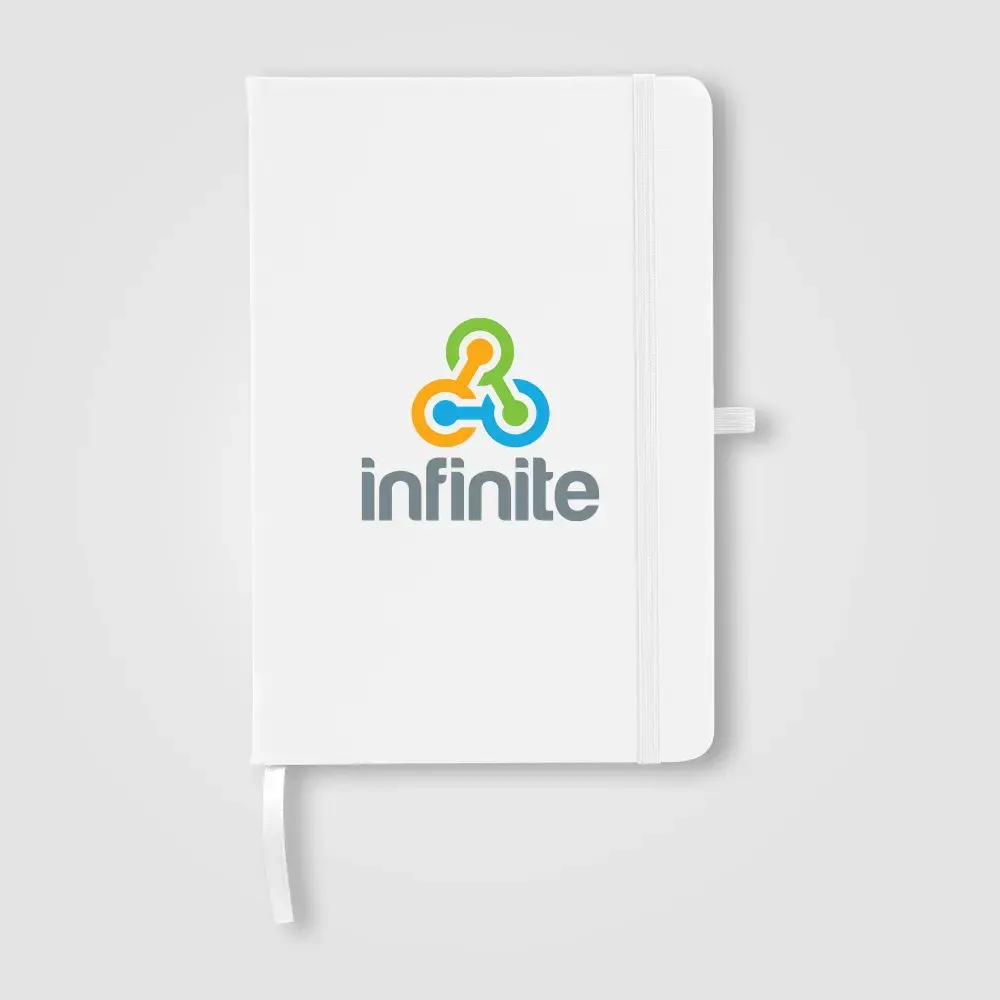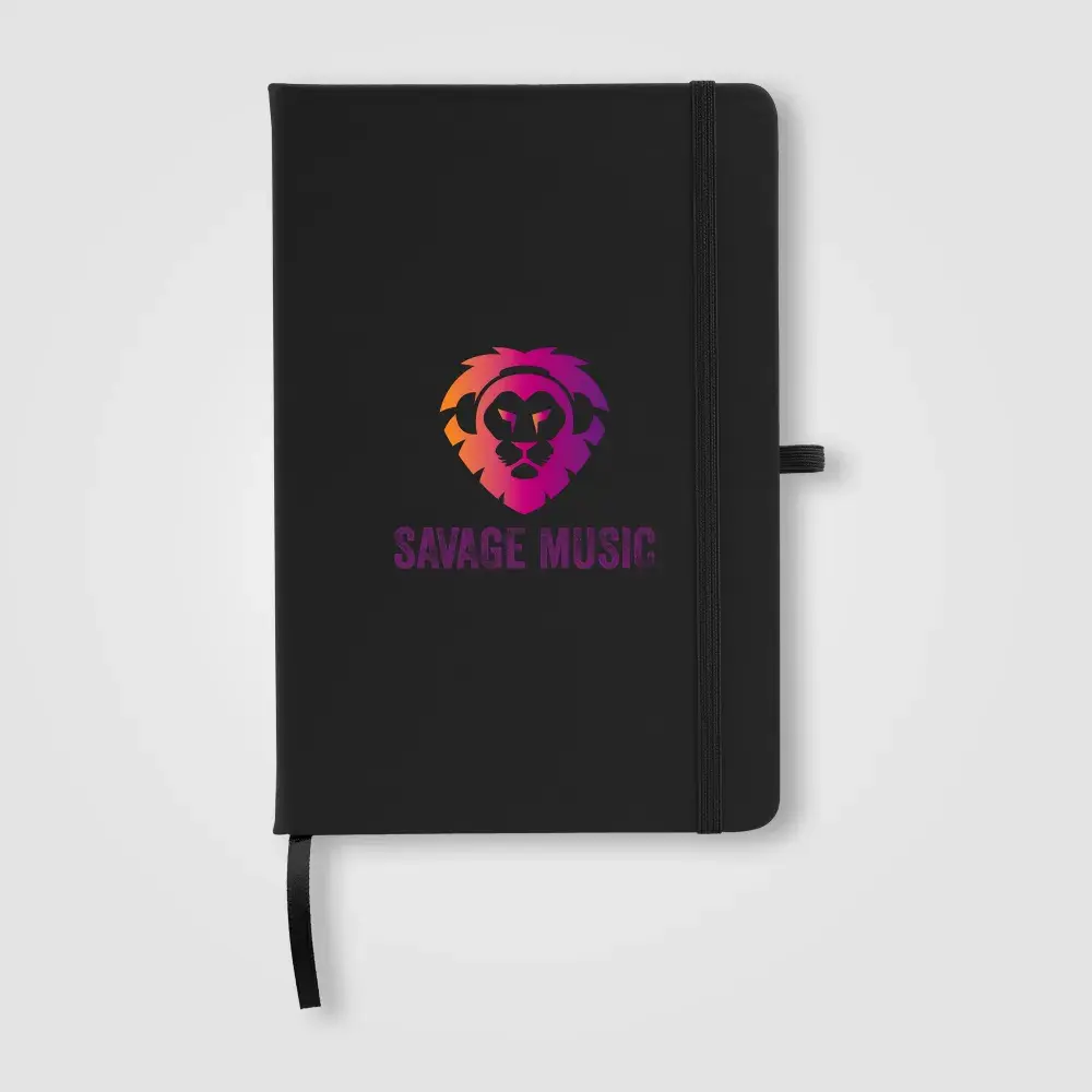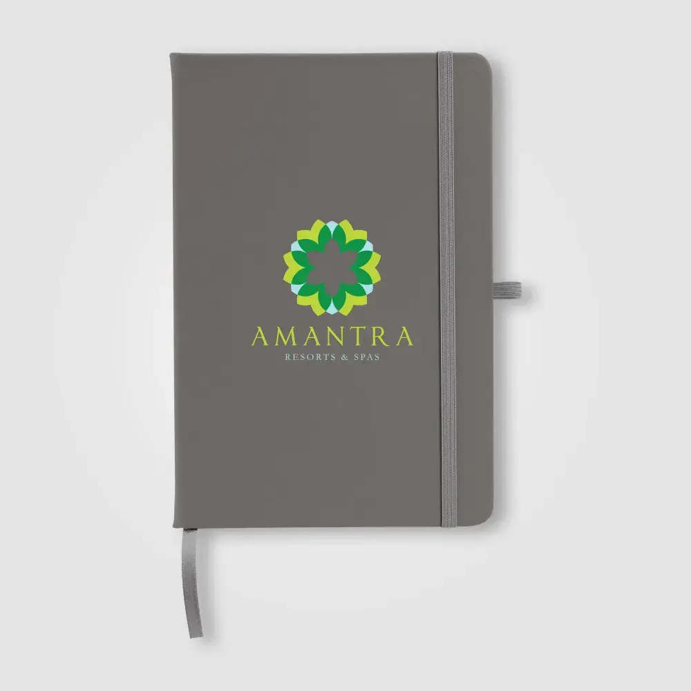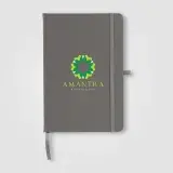 The Wilde Recycled Hard Cover Journal is a practical and stylish choice for both professionals and students. It contains 80 sheets (160 pages) of 70 gsm ivory paper sourced from responsibly managed forests, each lined for easy writing and securely bound. Rounded edges give it a sleek, modern look. For added convenience, it features a satin ribbon for page marking, an elastic strap, and a pen loop on the back, accented with silver grommets. Personalise the cover with your logo using Dboss.