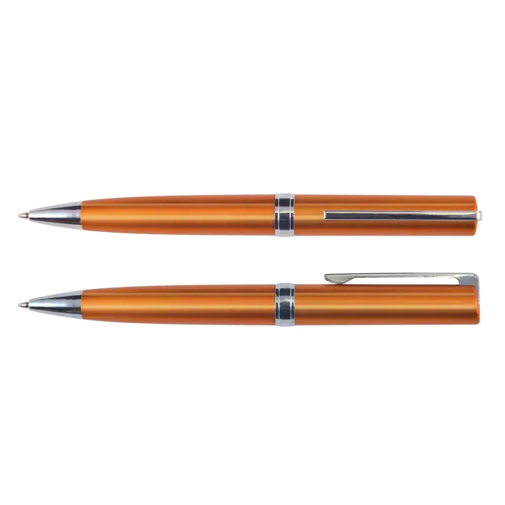 Coloured metallic barrel twist action ballpoint pen with chrome highlights.